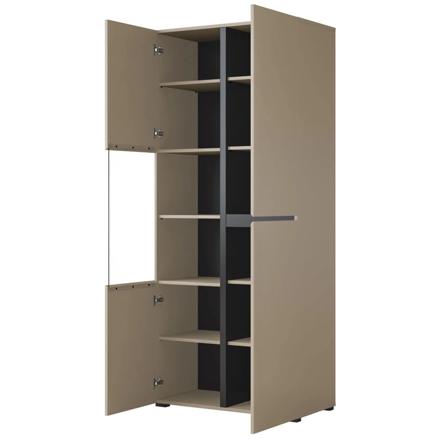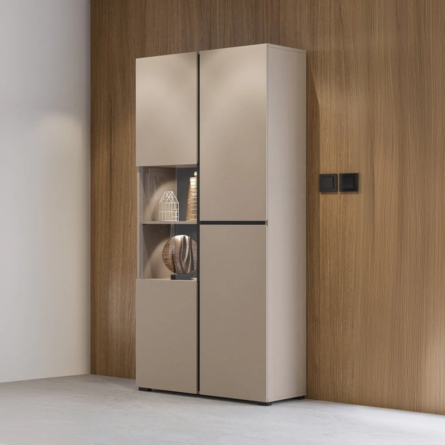 De vitrinekast Crotone heeft een strak en modern ontwerp met een combinatie van gesloten fronten en een open displayvak. Het open gedeelte biedt ruimte om accessoires zichtbaar neer te zetten, terwijl de overige vakken zorgen voor praktische opbergruimte. De rechte lijnen en greeploze afwerking geven de kast een rustige en eigentijdse uitstraling.