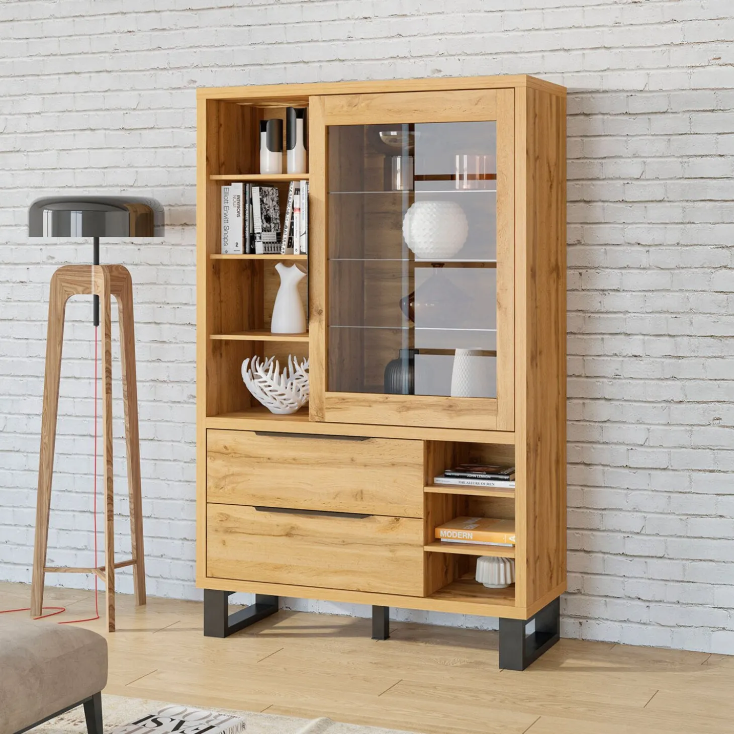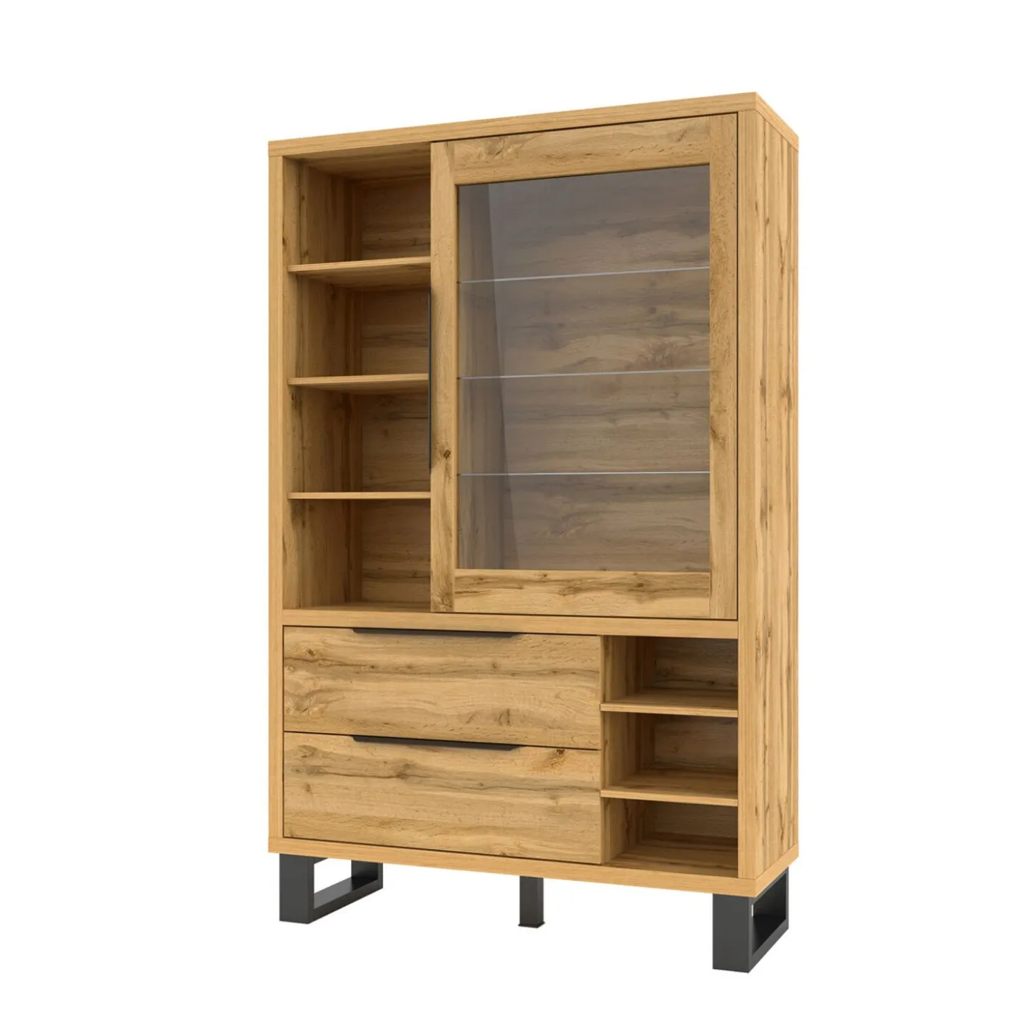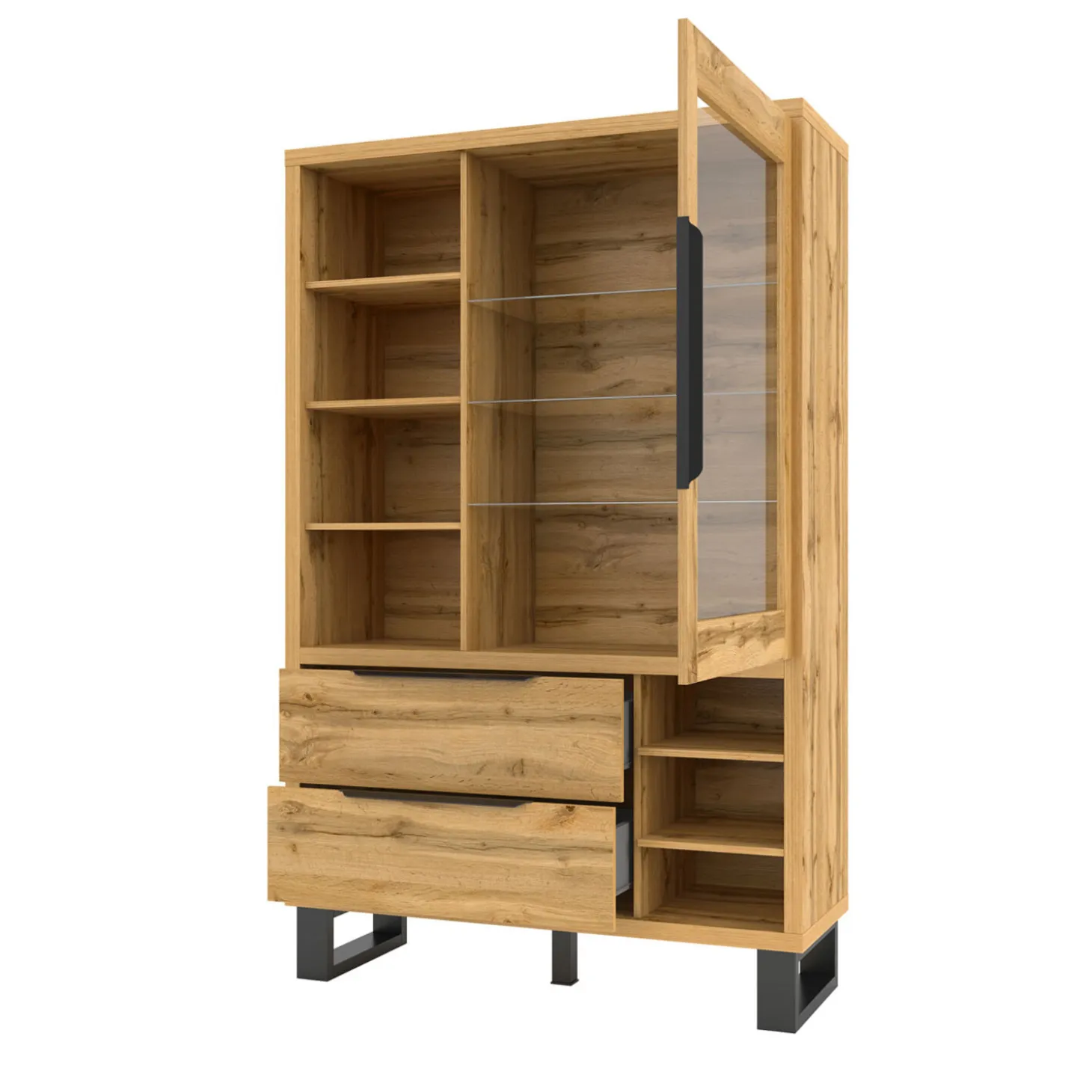 De vitrinekast Halmstad heeft een strak en functioneel ontwerp met een combinatie van open vakken, glas en gesloten lades. De indeling biedt ruimte om spullen zichtbaar neer te zetten en netjes op te bergen, terwijl het geheel een rustige en verzorgde uitstraling houdt. De rechte lijnen en stevige basis zorgen voor een moderne look.