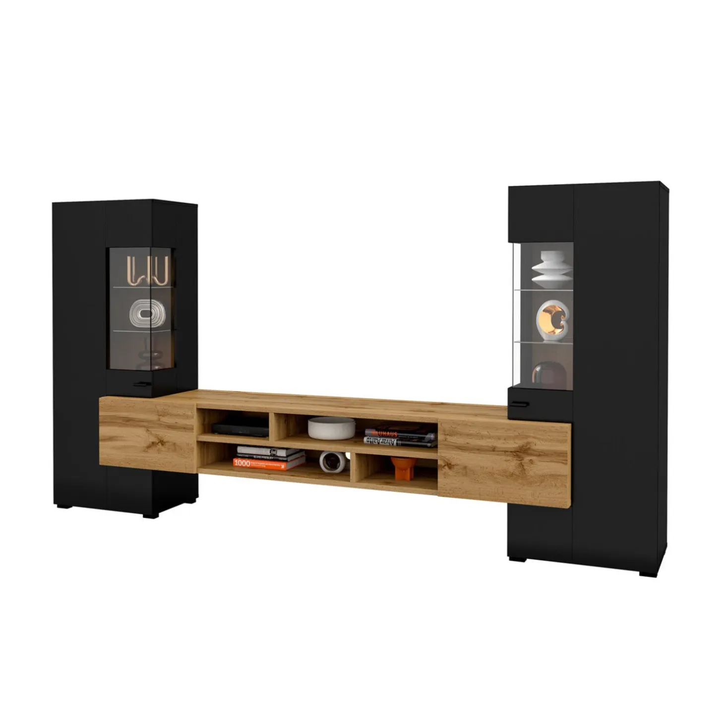 Wandcombinatie Koblenz heeft een strak en modern ontwerp met een krachtige horizontale belijning. De lange, zwevende tv unit vormt het rustige middelpunt, terwijl de twee hoge kasten aan weerszijden zorgen voor symmetrie en verticale balans. De combinatie van gesloten fronten en glazen vitrinedelen geeft het geheel diepte en structuur. Door de open vakken in het midden blijft de wand luchtig en overzichtelijk, terwijl het brede lijnenspel de ruimte optisch vergroot.