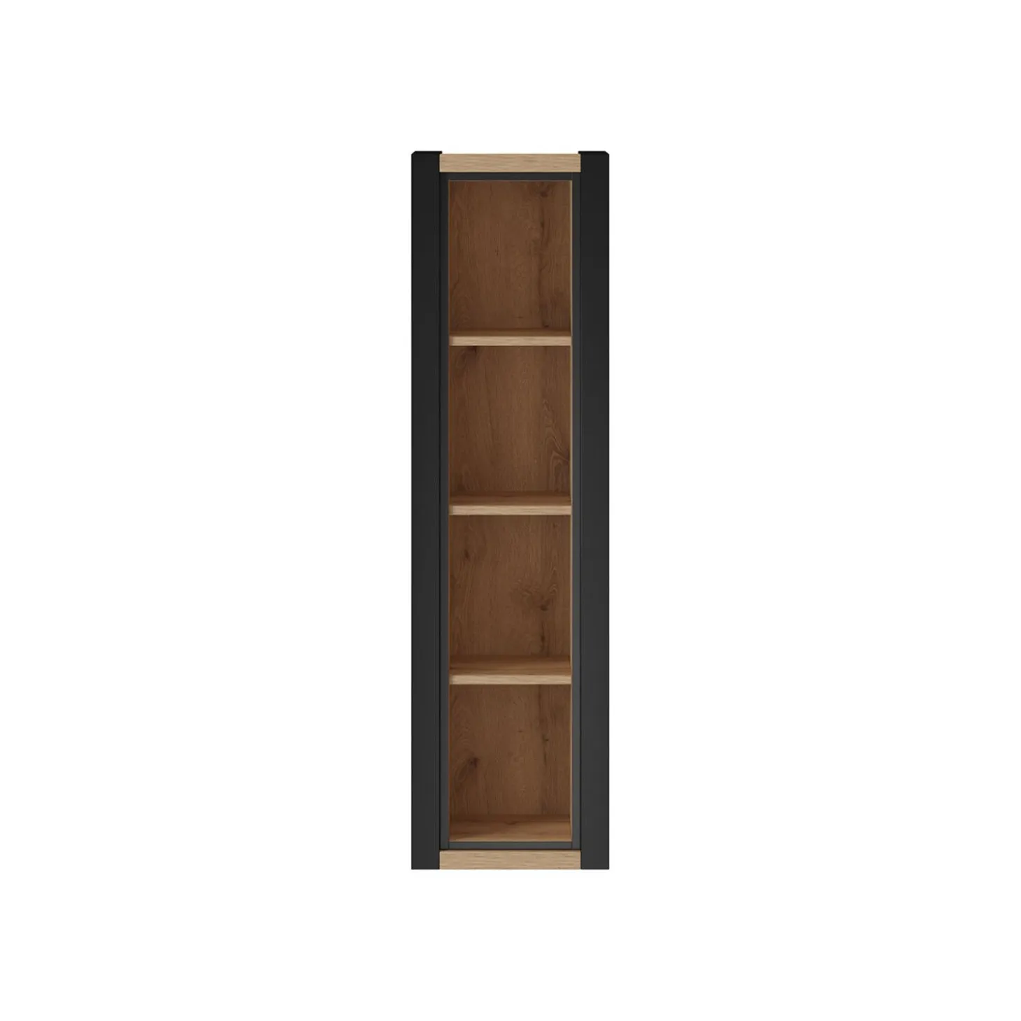 De wandkast Akven heeft een slanke en moderne uitstraling met een strak frame en open vakken. Door het verticale ontwerp en de open indeling is de kast ideaal om decoratie of servies stijlvol te presenteren zonder dat het zwaar oogt aan de muur.