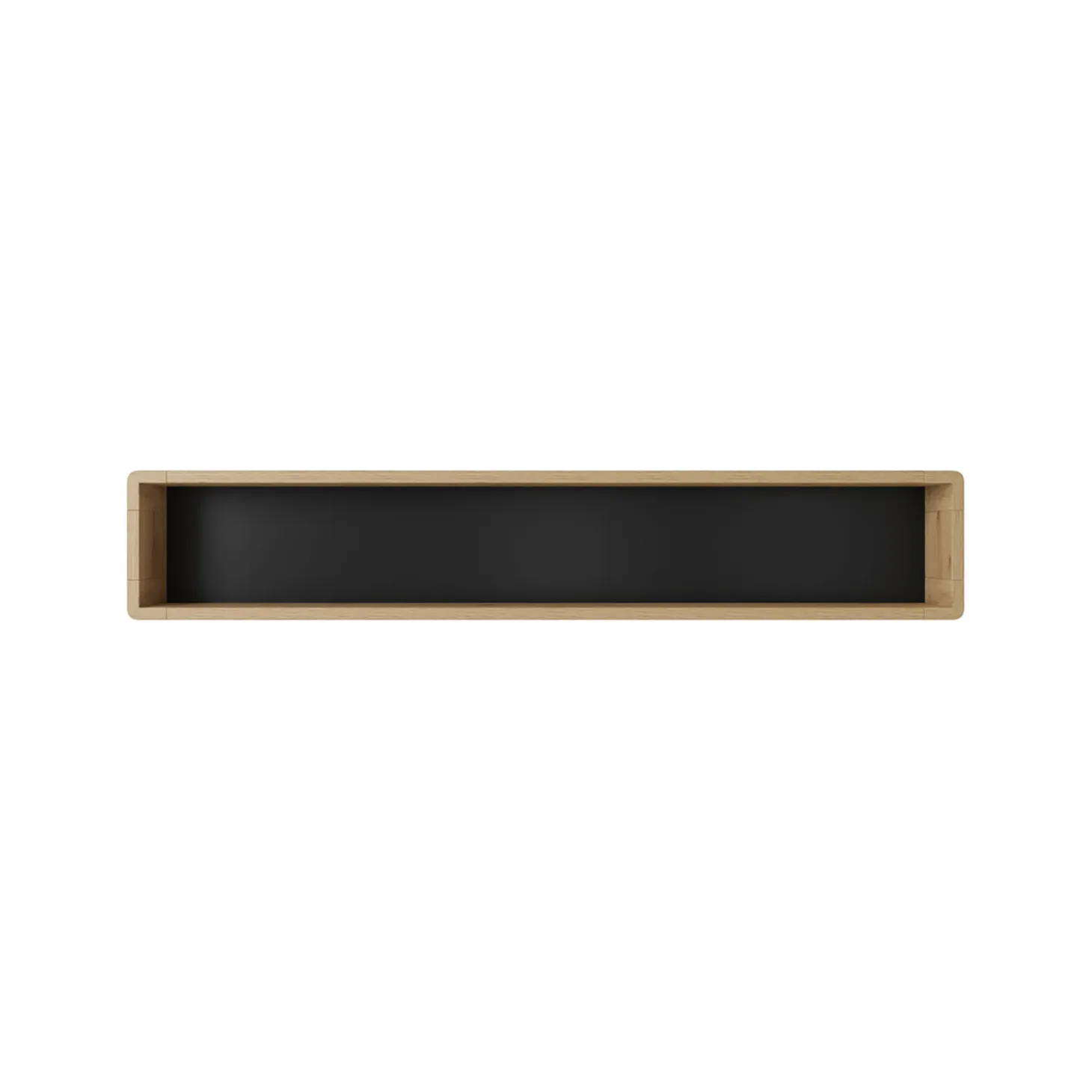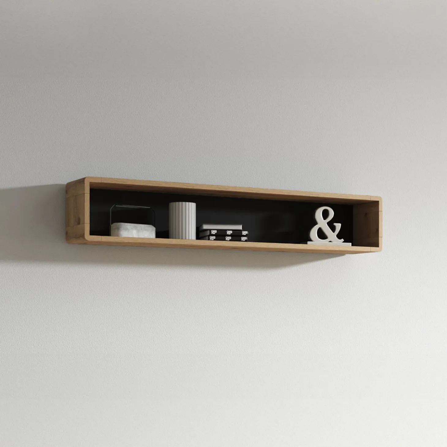 De wandkast heeft een strak en langwerpig ontwerp met een open karakter en zachte afgeronde hoeken. De diepe nis over de volledige breedte zorgt voor een rustig en zwevend effect aan de wand.