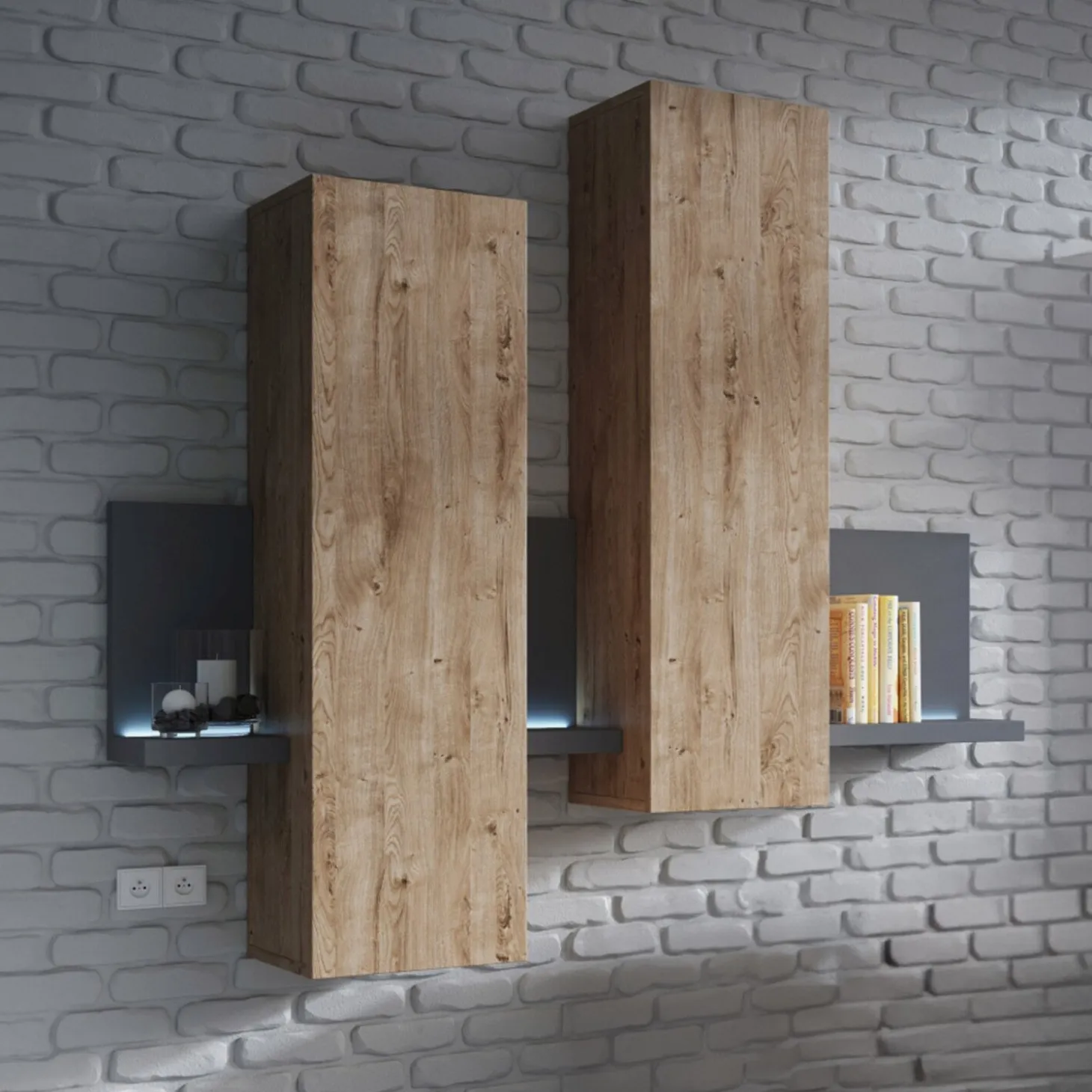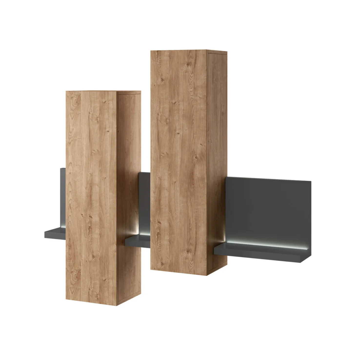 De wandkast Bologna in houtlook heeft een strak en minimalistisch design met zwevende elementen en een speelse, asymmetrische indeling. De combinatie van gesloten kasten en subtiele plateaus zorgt voor een licht en modern geheel aan de wand.