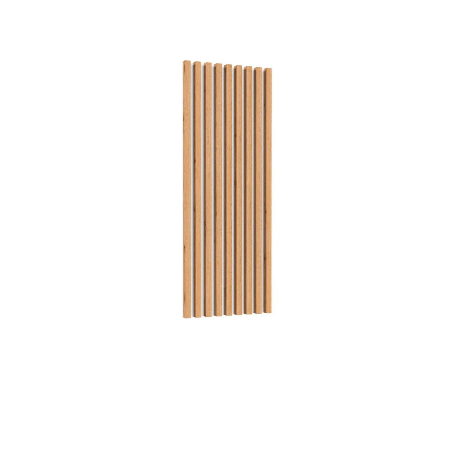 De latten zijn gelijkmatig geplaatst waardoor een mooi ritme ontstaat. Dit paneel is ideaal als los accent achter een tv meubel of als uitbreiding binnen een grotere wandopstelling. De combinatie van strakke lijnen en natuurlijke uitstraling maakt het paneel geschikt voor zowel moderne als warme interieurs.
