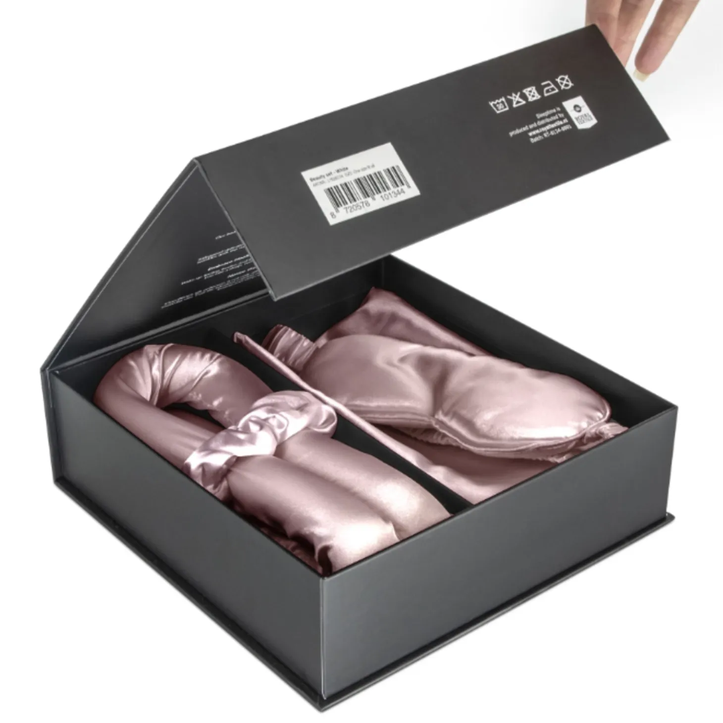 De Sleeptime Beauty Set bevat vier essentiële items die speciaal zijn ontworpen om je haar en huid te beschermen terwijl je slaapt. De satijnen kussensloop zorgt ervoor dat je haar ’s nachts niet pluist en voorkomt het ontstaan van slaaprimpels. Het satijnen oogmasker biedt een zachte, comfortabele pasvorm en helpt bij het verminderen van oogrimpels. De satijnen scrunchie houdt je haar op zijn plaats zonder het te beschadigen, ideaal voor elk haartype.