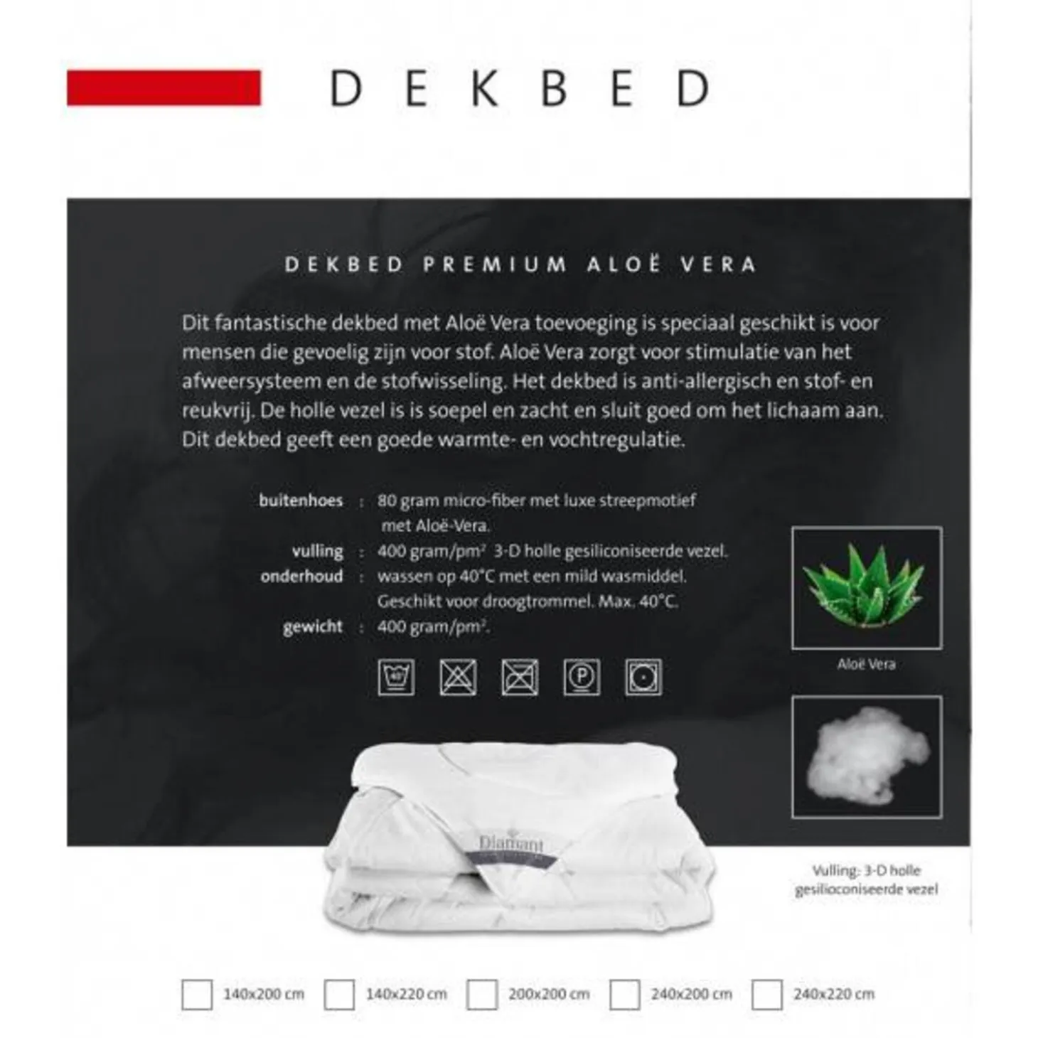 Dit fantastisch dekbed met Aloe Vera toevoeging is speciaal geschikt voor mensen die gevoelig zijn voor stof. Aloe Vera zorgt voor stimulatie van het afweersysteem en de stofwisseling. Het dekbed is anti-allergisch en stof- en reukvrij. De holle vezel is soepel en zacht en sluit goed om het lichaam aan. Dit dekbed geeft een goede warmte- en vochtregulatie.