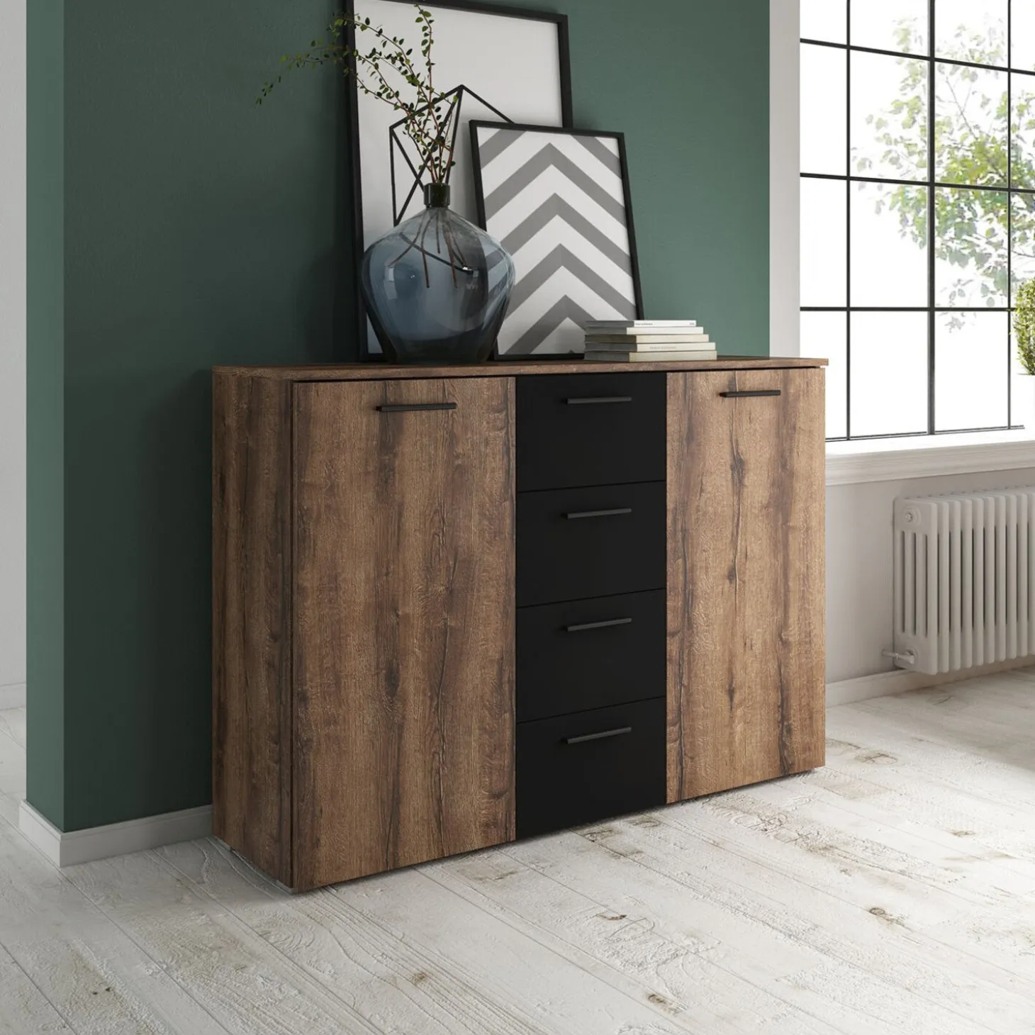 Het dressoir Bern heeft een praktisch en overzichtelijk ontwerp met een duidelijke indeling. De combinatie van kastdeuren en lades zorgt voor een functioneel geheel met een rustige en toegankelijke uitstraling.