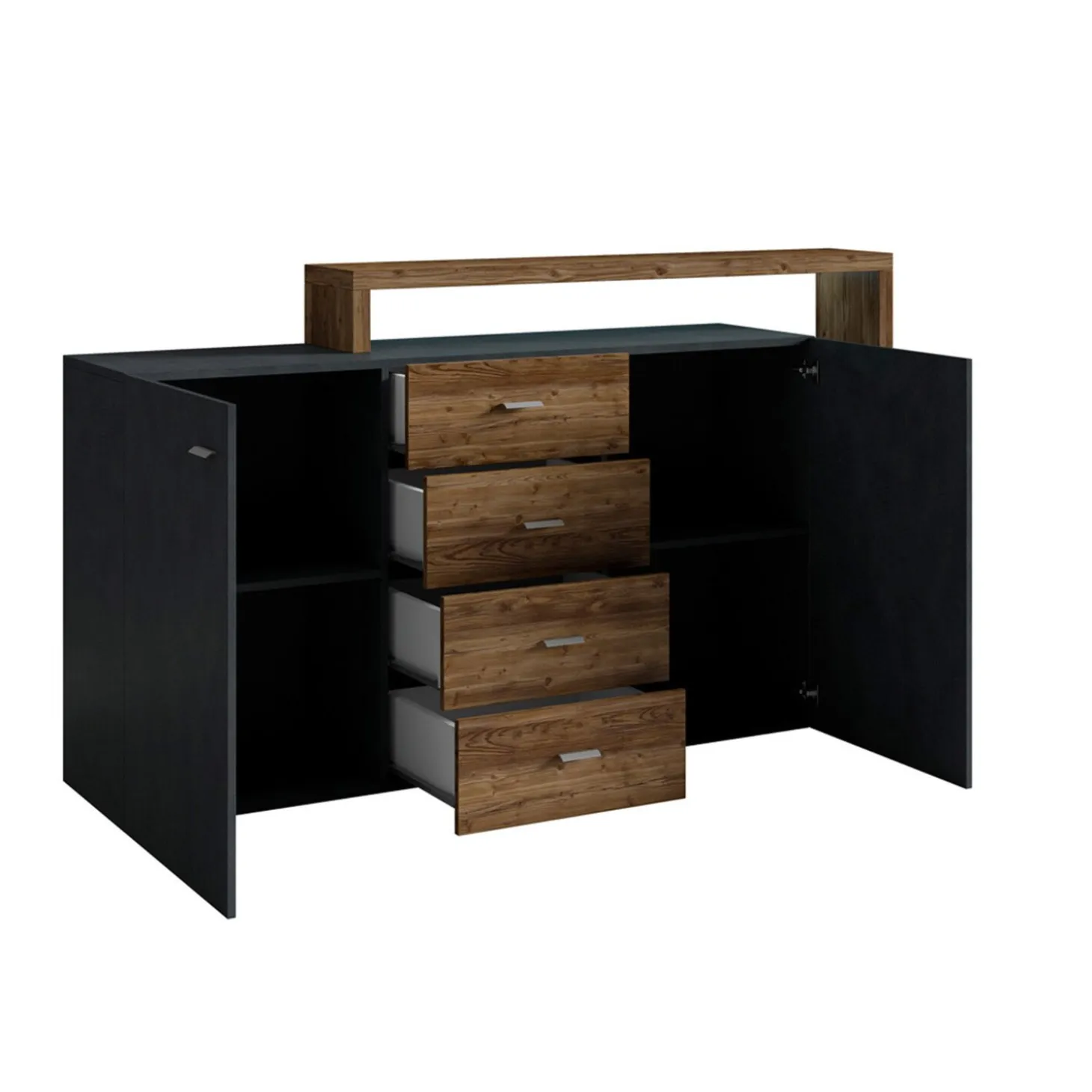 Het dressoir Bologna heeft een rustige en moderne uitstraling met een strakke indeling van deuren, lades en open vakken. De combinatie van gesloten opbergruimte en een open bovendeel zorgt voor een praktisch en luchtig geheel in de ruimte.