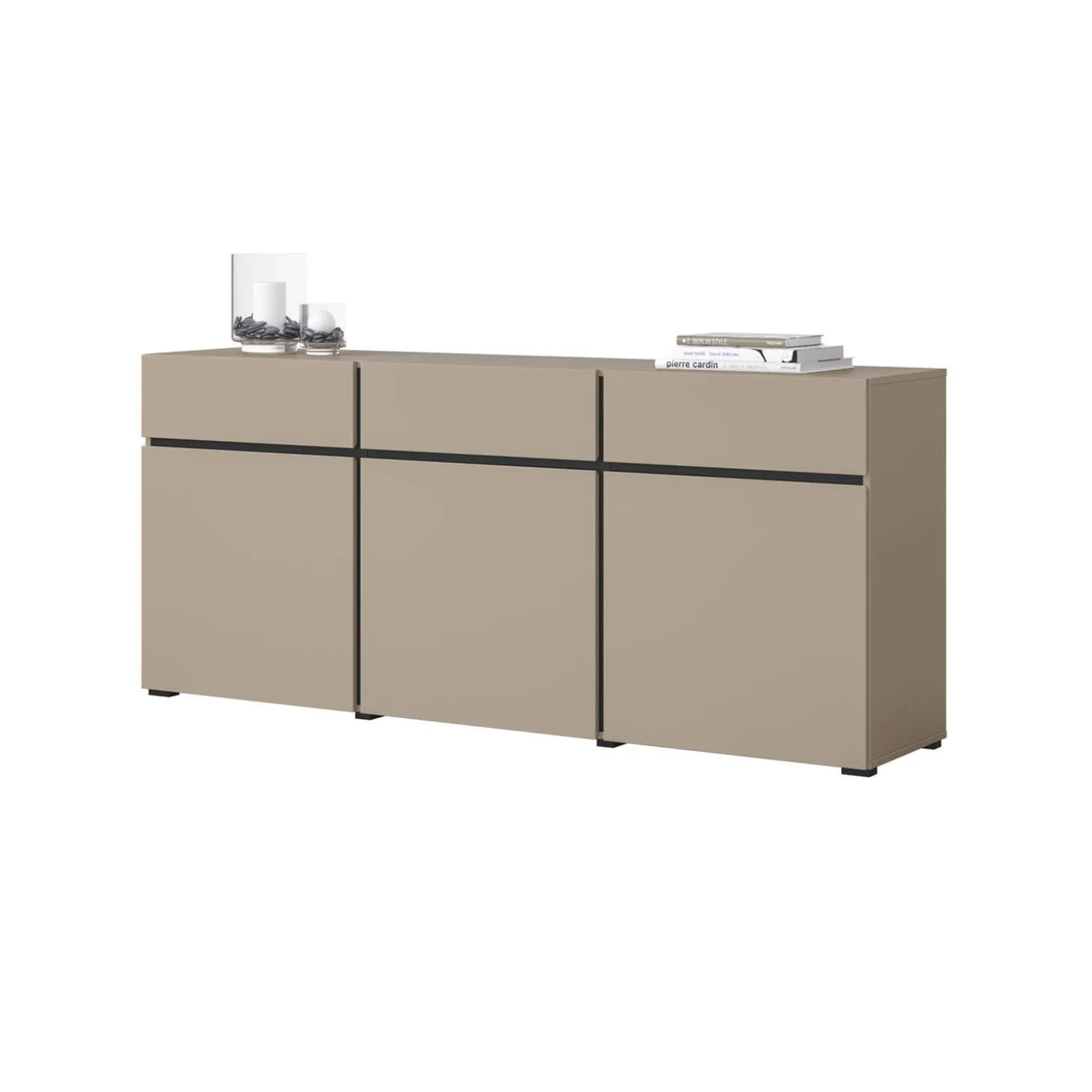 Het dressoir Crotone heeft een strak en modern ontwerp met een greeploos front en een rustige, symmetrische indeling. De combinatie van meerdere kastvakken zorgt voor overzichtelijke opbergruimte, terwijl het minimalistische design zorgt voor een nette en eigentijdse uitstraling.