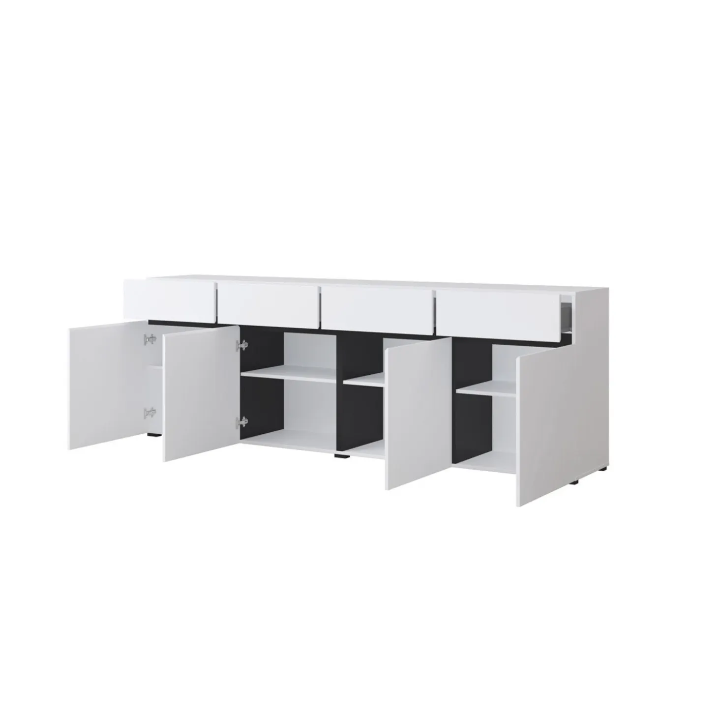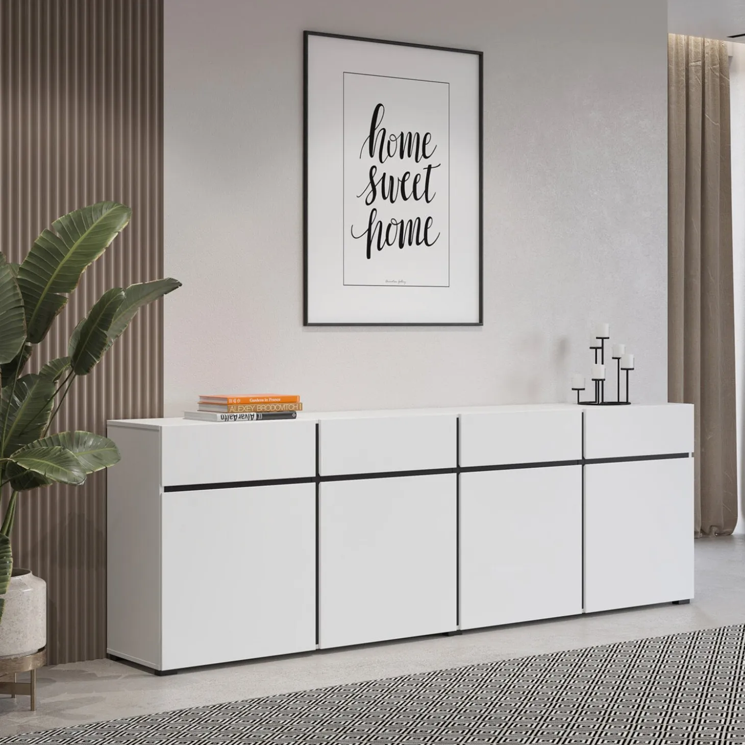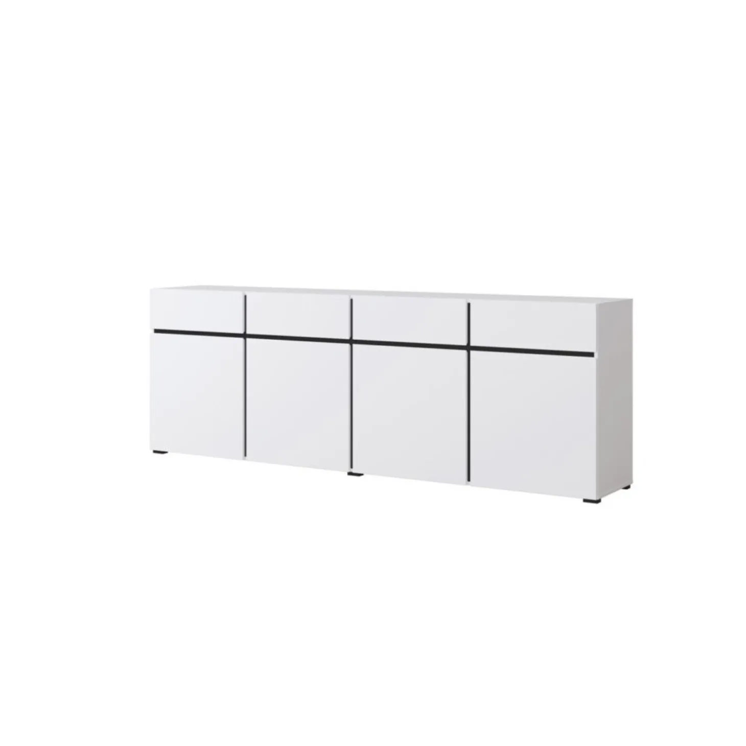 Het dressoir Crotone heeft een strak en modern ontwerp met een greeploos front en een rustige, symmetrische indeling. De brede opzet met meerdere vakken biedt veel opbergruimte, terwijl het minimalistische design zorgt voor een nette en eigentijdse uitstraling.