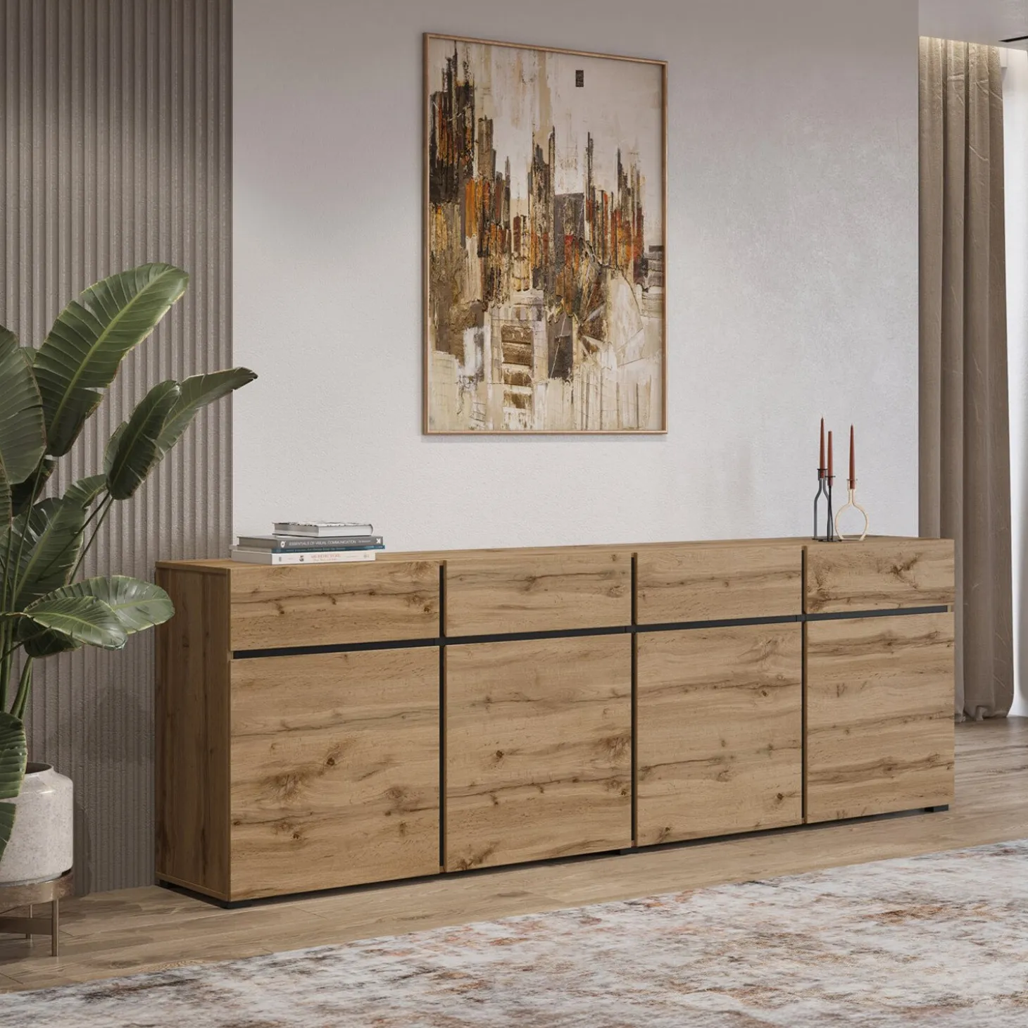 Het dressoir Crotone heeft een strak en modern ontwerp met een greeploos front en een rustige, symmetrische indeling. De brede opzet met meerdere vakken biedt veel opbergruimte, terwijl het minimalistische design zorgt voor een nette en eigentijdse uitstraling.