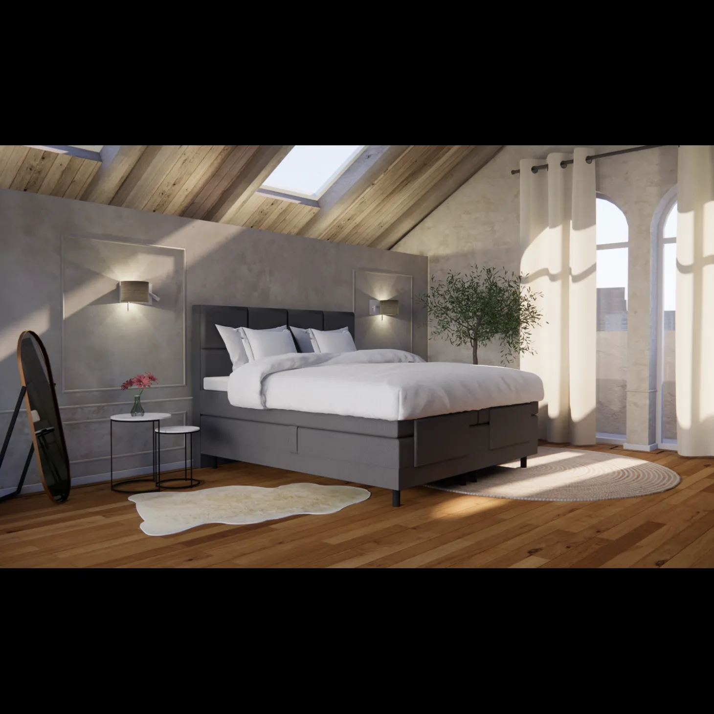 Motor & Frame: De elektrische boxspring wordt geleverd met krachtige 6000 newton motoren. Het half-frame is volledig weggewerkt in een houten omranding dat gestoffeerd is in dezelfde luxe meubelstof als de boxspring.