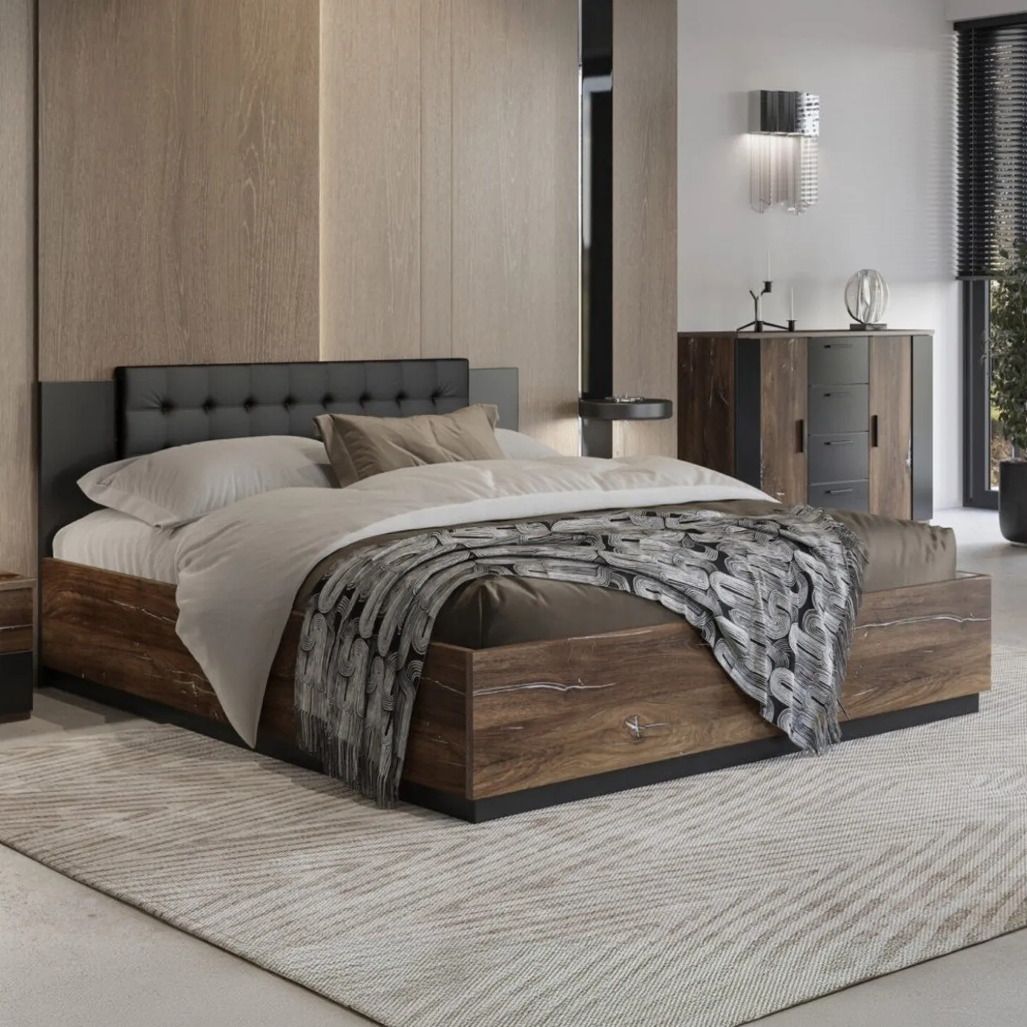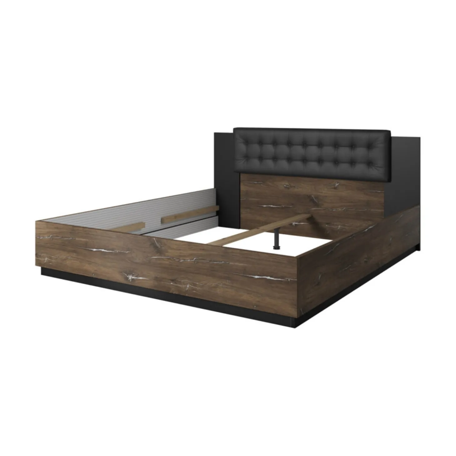 Het Houten Bed Siena combineert warme houttinten met moderne elegantie. Het bedframe krijgt extra karakter door het zwart gecushionede hoofdbord, afgewerkt met subtiele gestikte knopen. Deze stijlvolle combinatie van materialen zorgt voor een comfortabele en luxueuze uitstraling, perfect passend in een hedendaagse slaapkamer. Het bed wordt geleverd zonder matras en zonder lattenbodem.