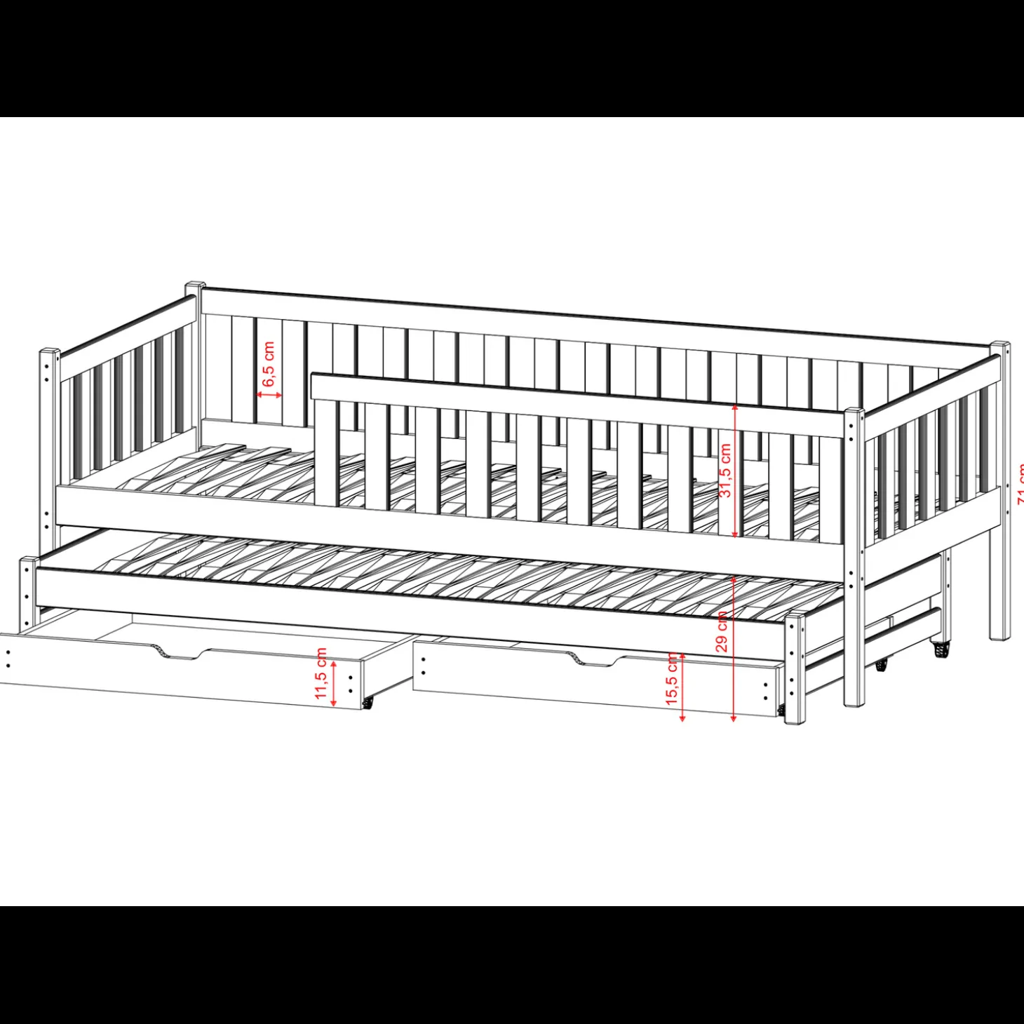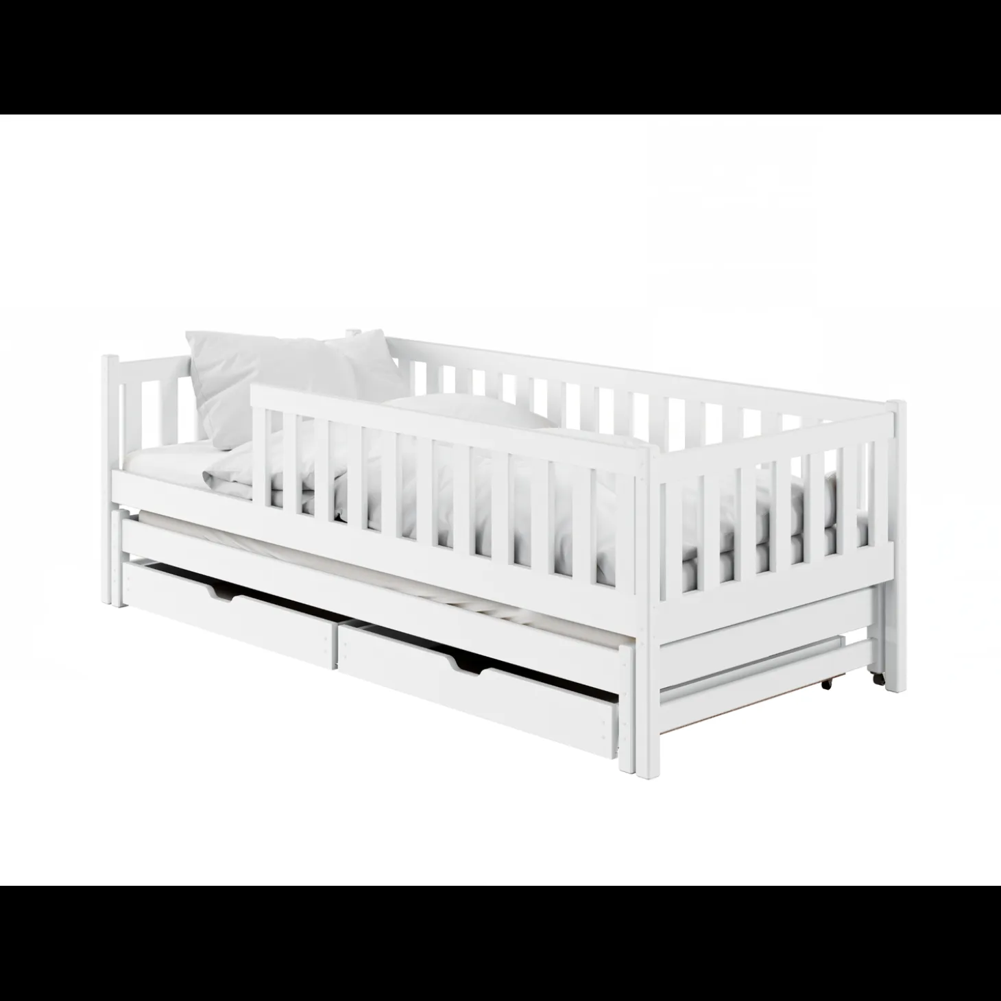 Het kajuitbed Cody heeft een open en gebalanceerde uitstraling met rondom slanke spijlen en een verhoogde zijrand. Onder het bed is een extra slaapgedeelte verwerkt dat eenvoudig uitgeschoven kan worden, gecombineerd met praktische opberglades. Het ontwerp oogt rustig en functioneel, waarbij slapen, opbergen en extra slaapruimte samenkomen in één geheel.