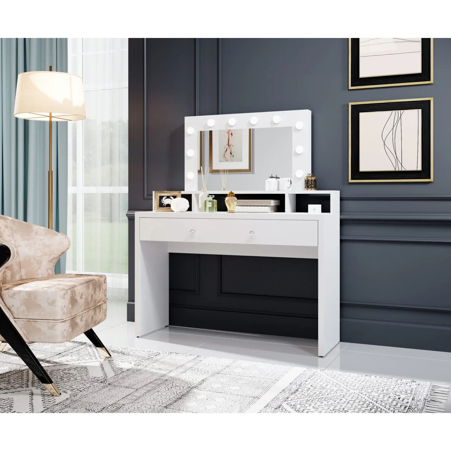 Het royale spiegelpaneel is omringd door stijlvolle LED-verlichting, zodat je altijd beschikt over perfect licht voor je dagelijkse beauty- en verzorgingsroutine. De handige open vakken bieden ruimte voor make-up, parfum of accessoires die je graag binnen handbereik hebt. Daarnaast beschikt de kaptafel over een ruime lade met sierlijke knoppen, ideaal voor het netjes opbergen van al je beauty essentials.