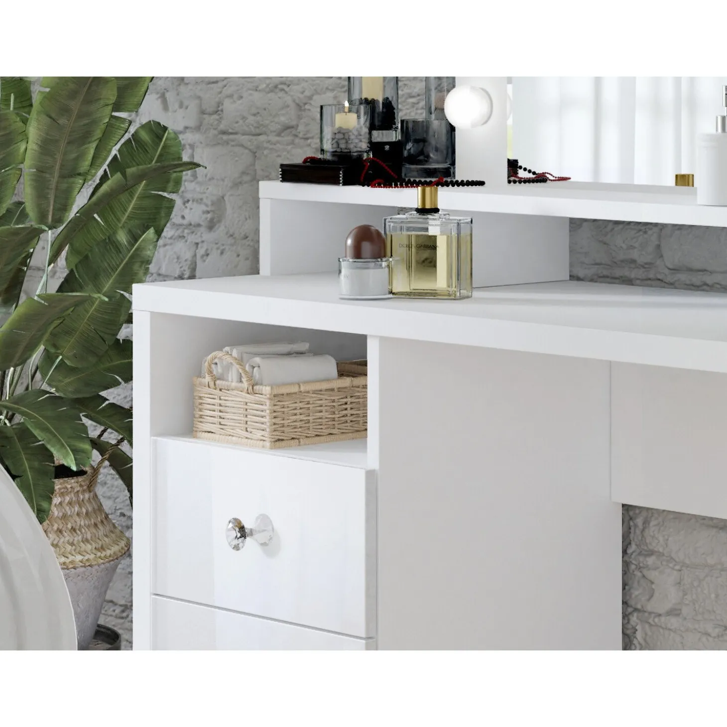 De Kaptafel Diana combineert luxe en functionaliteit in een elegant ontwerp. Uitgevoerd in hoogglans wit, brengt deze kaptafel een moderne en stijlvolle uitstraling in je slaapkamer of dressing. Het royale spiegelpaneel met LED-verlichting zorgt voor de perfecte belichting tijdens het opmaken of verzorgen.