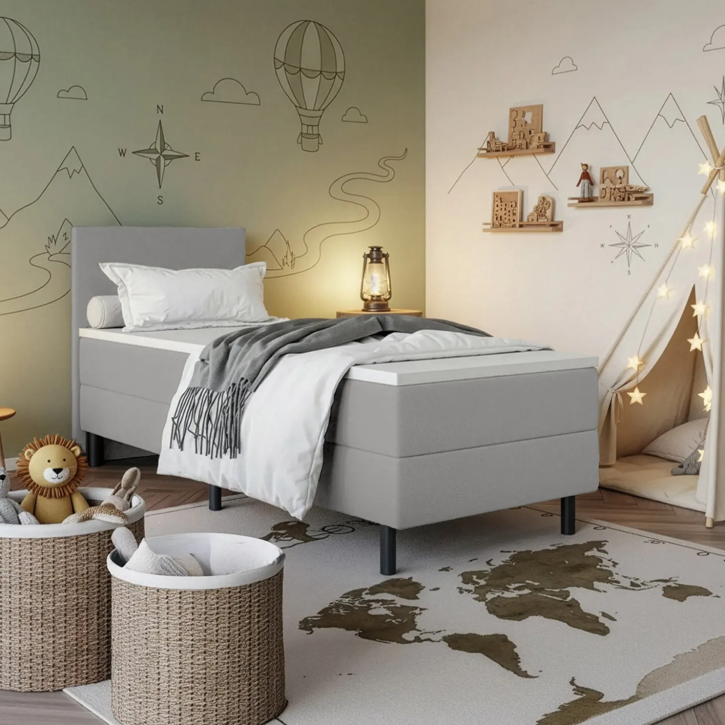 De vlakke boxen van Kinderboxspring Liv zijn opgebouwd uit een stevige houten constructie en afgewerkt met een duurzame, geweven meubelstof. Elke box staat op zes poten, wat zorgt voor goede stabiliteit en betrouwbare ondersteuning bij dagelijks gebruik in de kinder of tienerkamer.