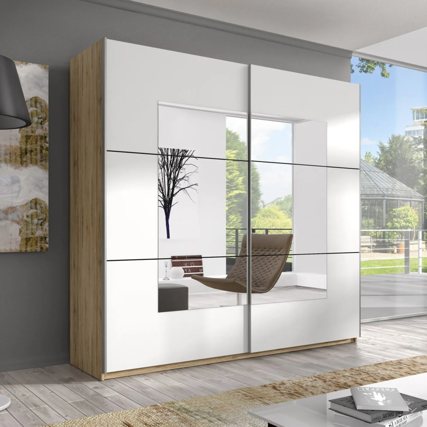 De kledingkast Bern heeft een strak en modern ontwerp met grote, vlakke deuren en een symmetrische vlakverdeling. De geïntegreerde spiegelvlakken zorgen voor een ruimtelijk effect en geven de kast een lichte en moderne uitstraling.