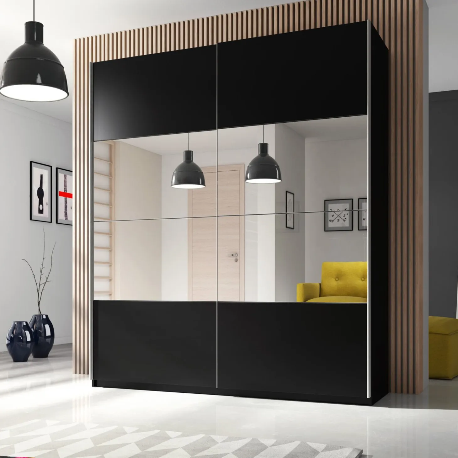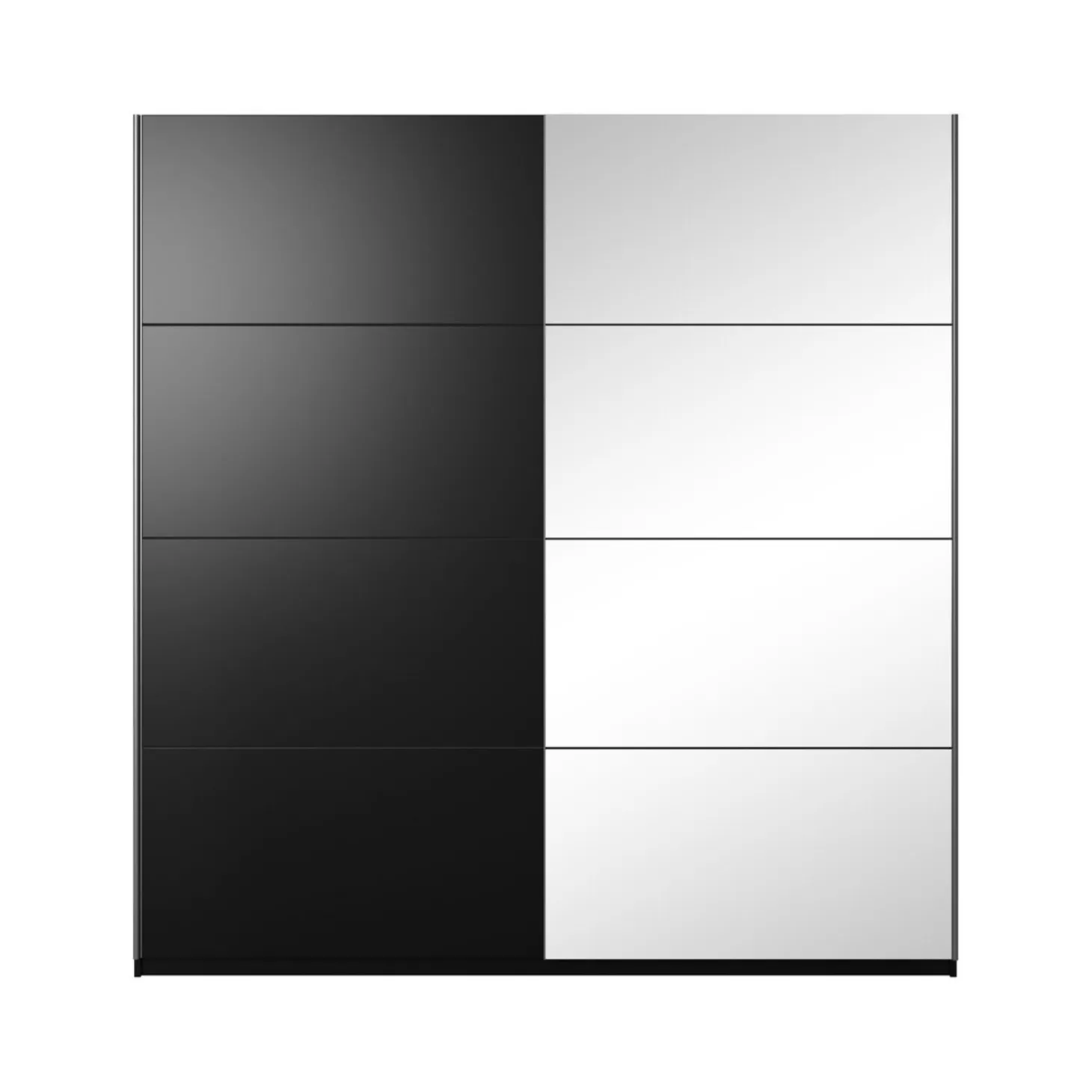 De kledingkast Bern in zwarte uitvoering heeft een strak en modern design met brede schuifdeuren en een symmetrische vlakverdeling. De grote spiegeldeur versterkt het ruimtelijke effect, terwijl de glanzende fronten zorgen voor een robuuste en chique uitstraling.