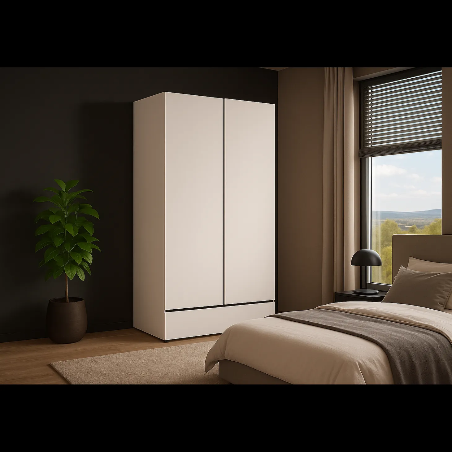 De Kledingkast Crotone brengt strak, minimalistisch design samen met veel opbergruimte. Het rechte silhouet wordt verfraaid door het kenmerkende frontdesign, waarin horizontale en verticale lijnen elkaar kruisen in een subtiel grafisch motief. Dit detail geeft de kast een moderne, onderscheidende uitstraling zonder onnodige opsmuk.