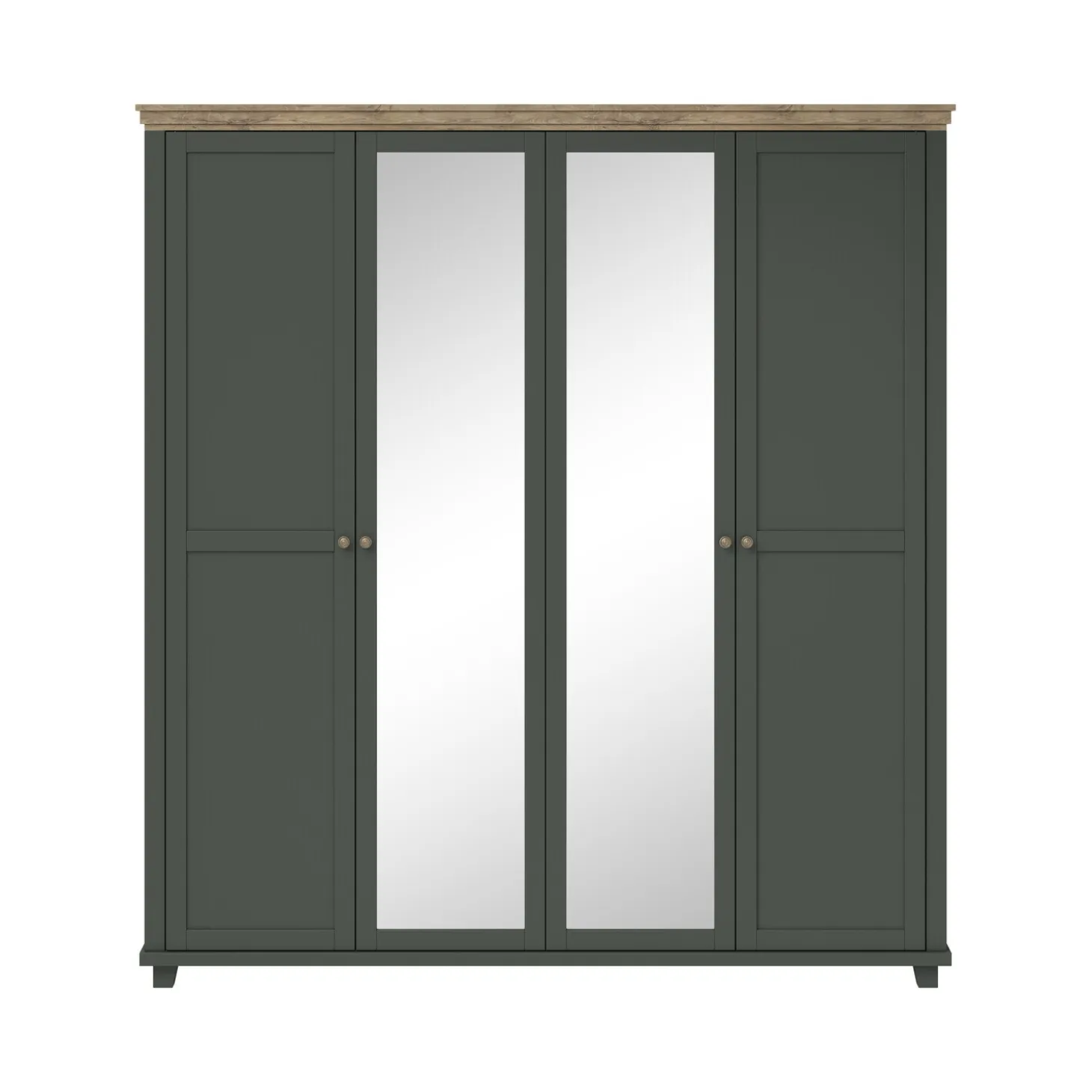 De Kledingkast Elvas 4-Deurs combineert landelijke charme met royale opbergruimte. Het diepe donkergroen in combinatie met het warme houtlook bovenblad en de elegante knopgrepen geeft de kast een rustige en sfeervolle uitstraling. Dankzij de dubbele spiegeldeuren oogt de kamer ruimer en voeg je praktisch gemak toe aan je slaapkamer.