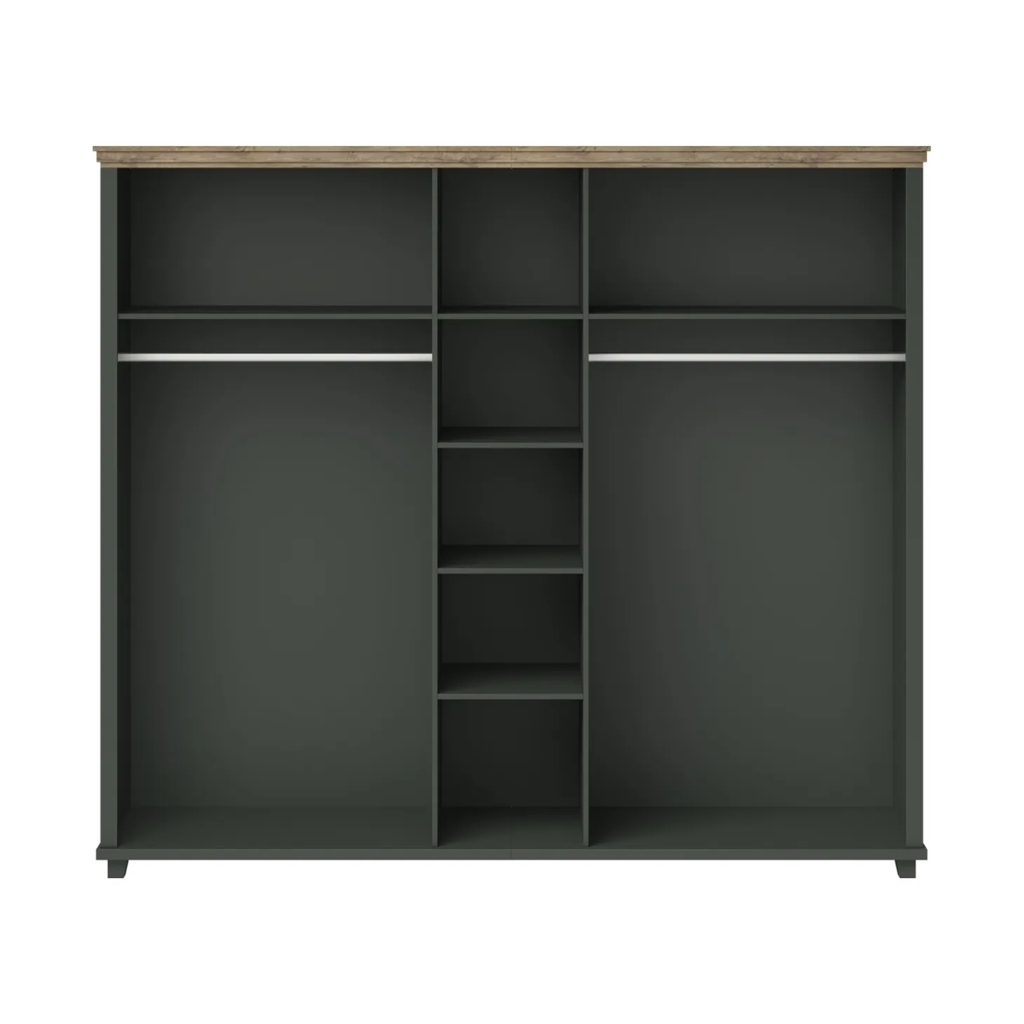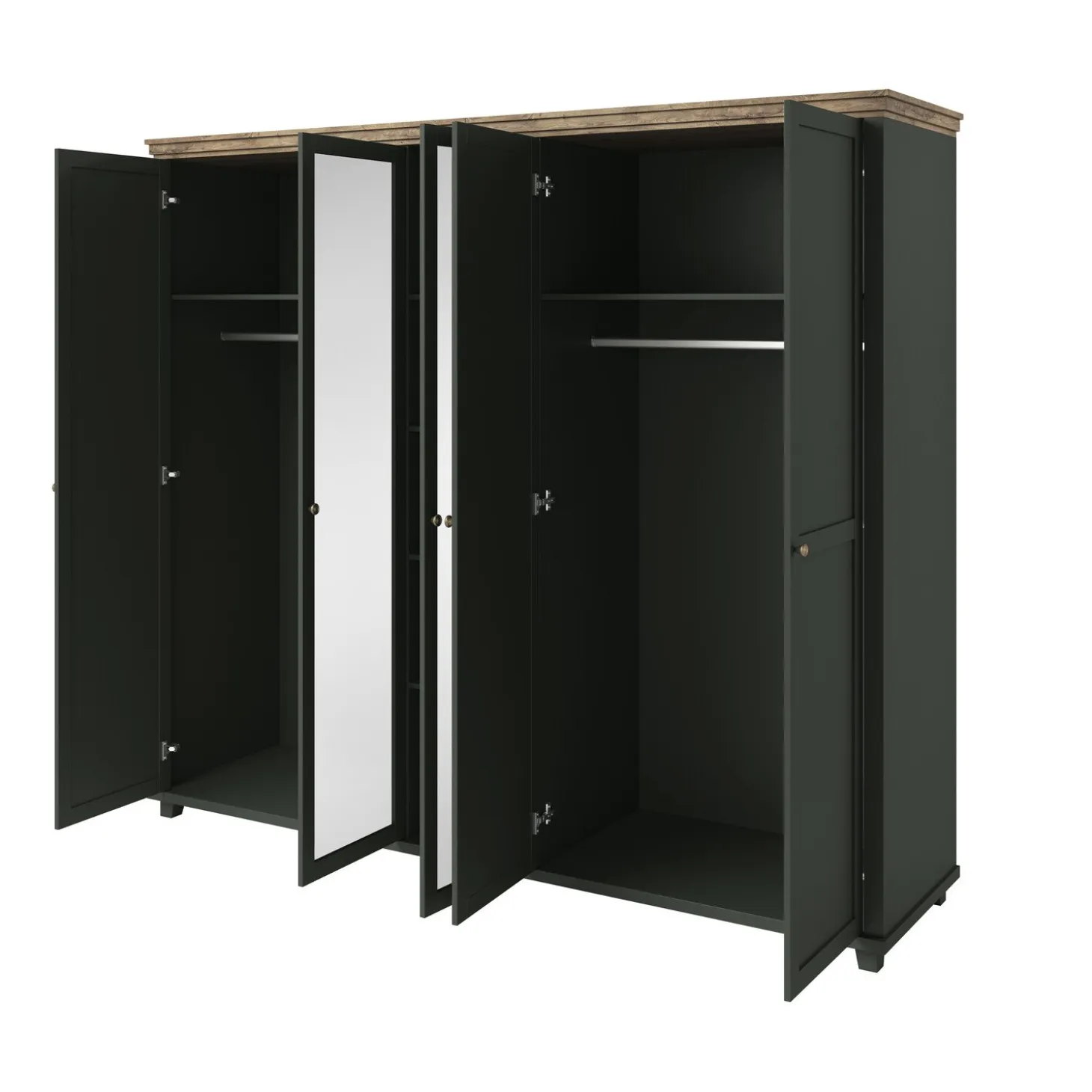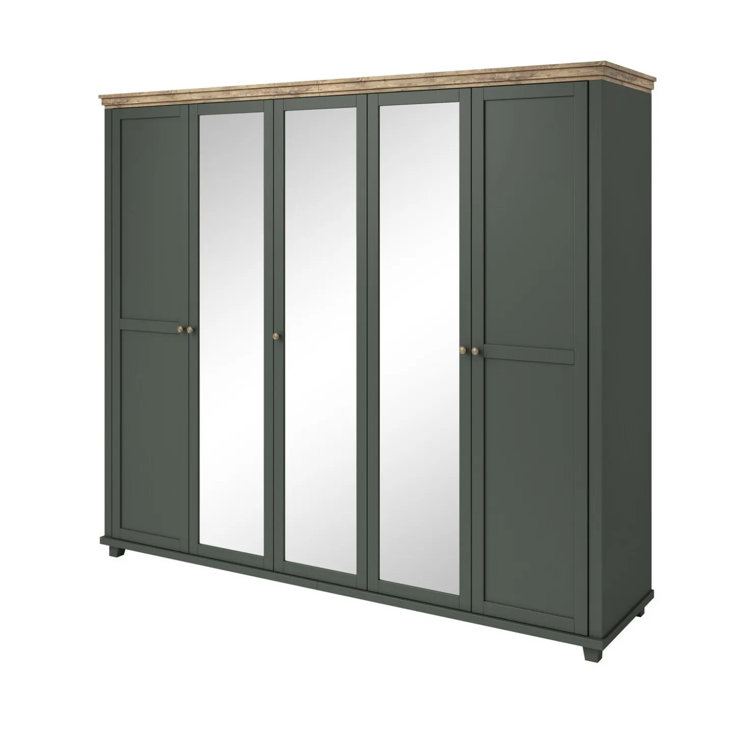 De Kledingkast Elvas 5-Deurs is een royale kast die stijl en functionaliteit perfect combineert. Uitgevoerd in een diepe donkergroene kleur met een warm houtlook bovenblad en elegante knopgrepen, straalt deze kast rust en klasse uit. Het landelijke ontwerp maakt de Elvas geschikt voor zowel moderne als klassieke slaapkamers.