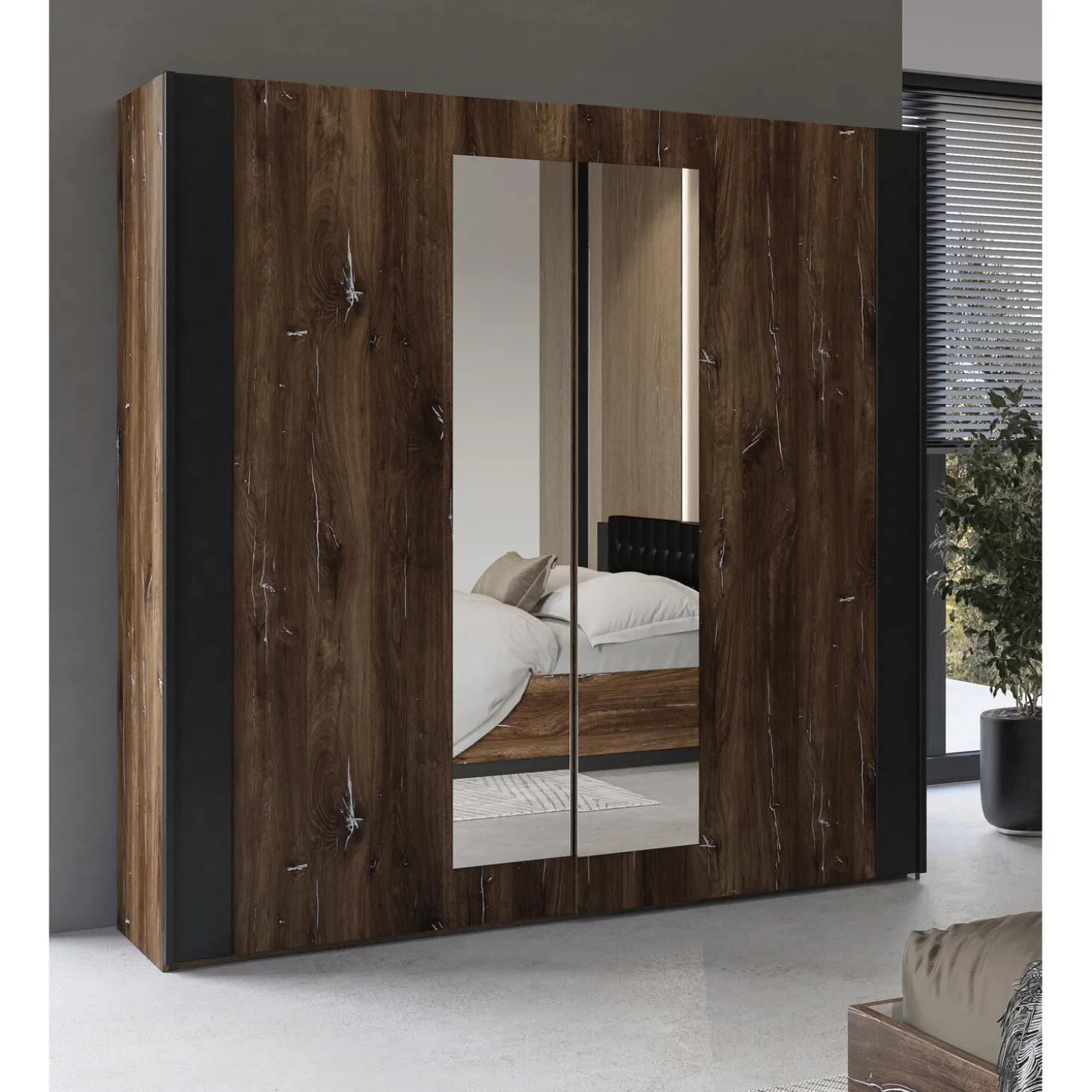 De Kledingkast Siena combineert stoer design met praktische opbergruimte. De warme houtlook in combinatie met de zwarte accenten en dubbele spiegeldeuren geeft de kast een moderne en eigentijdse uitstraling. Dankzij de schuifdeuren is de kast bovendien ruimtebesparend en ideaal voor zowel grote als kleinere slaapkamers.