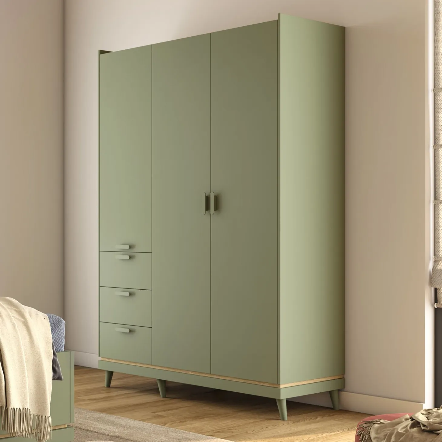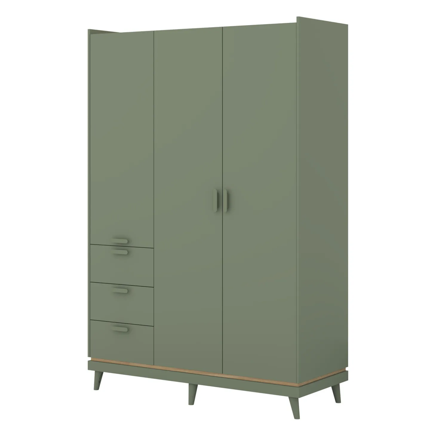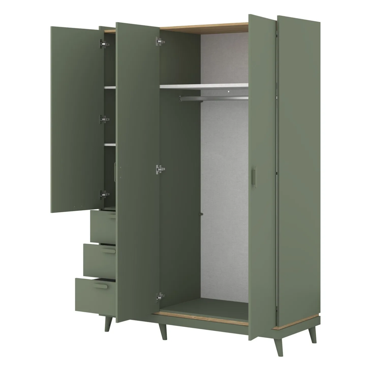 De Kledingkast Skagen combineert eenvoud met royale opbergruimte. Het strakke silhouet wordt verlevendigd door subtiele houtaccenten en slanke poten, wat de kast een luchtige en moderne uitstraling geeft. Achter de drie deuren vind je een praktische indeling met legplanken, een kledingroede en drie handige lades – ideaal voor het overzichtelijk opbergen van kleding, schoenen en accessoires.