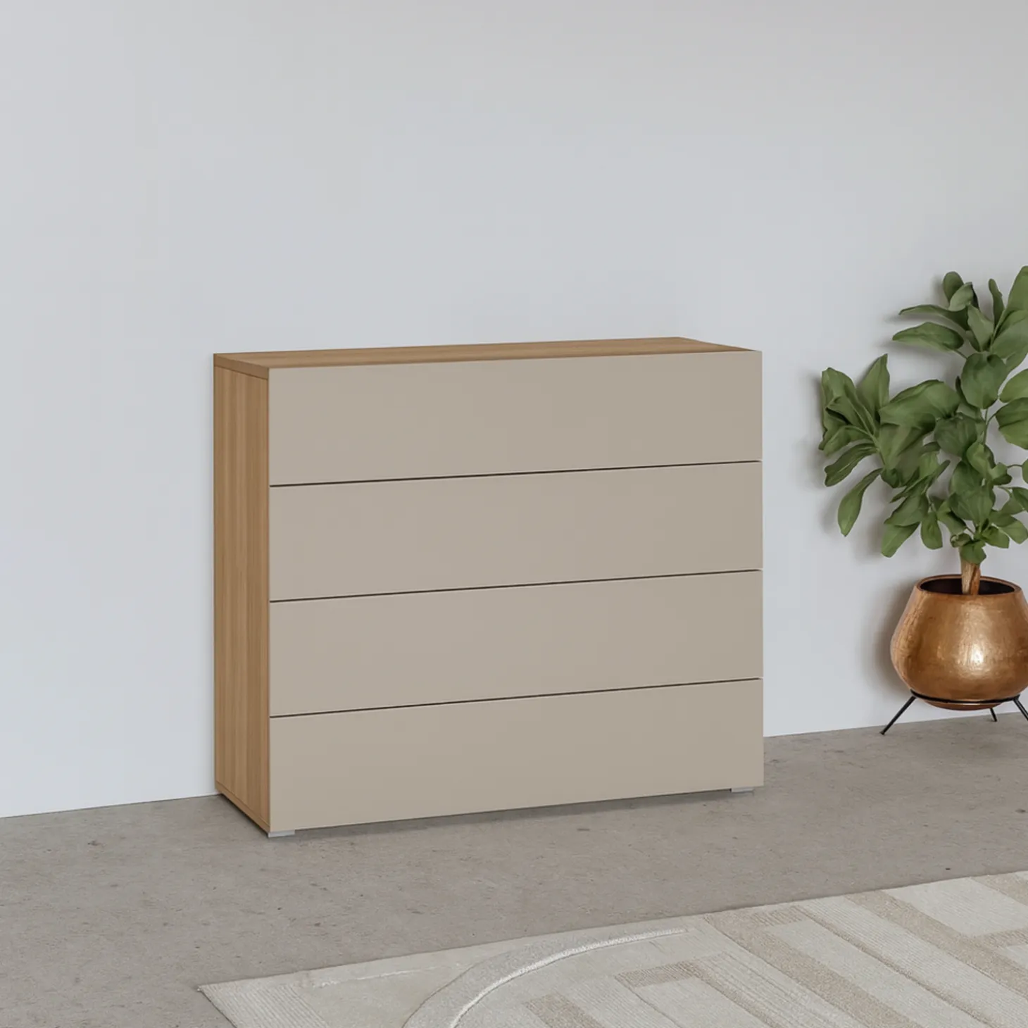 De Ladekast Imola straalt moderne eenvoud uit door de combinatie van warme eikenlook en strakke taupekleurige fronten. Het minimalistische ontwerp zonder zichtbare handgrepen zorgt voor een rustig en stijlvol geheel dat moeiteloos past in uiteenlopende interieurs.