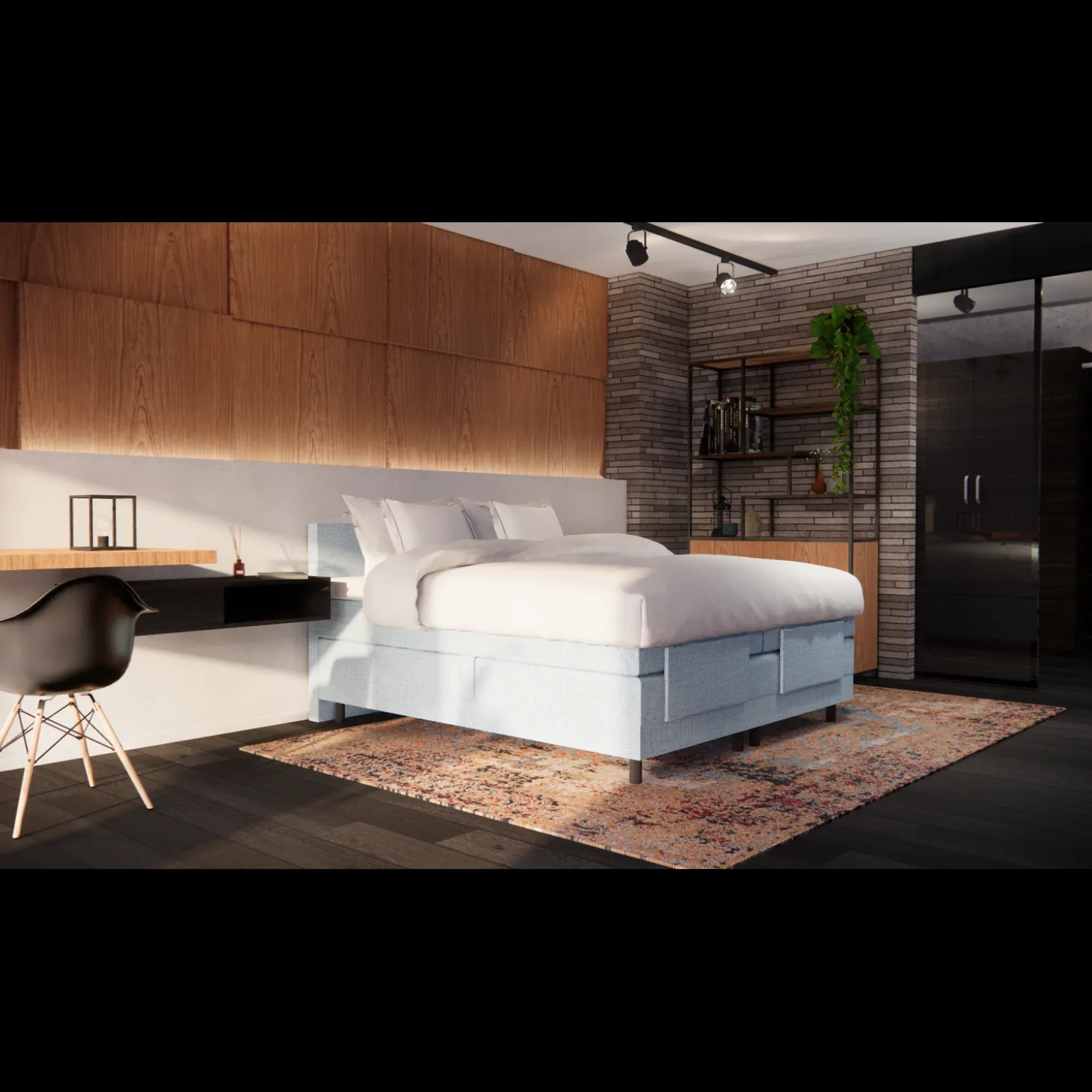 Motor & Frame: De elektrische boxspring wordt geleverd met krachtige 6000 newton motoren. Het half-frame is volledig weggewerkt in een houten omranding dat gestoffeerd is in dezelfde luxe meubelstof als de boxspring.