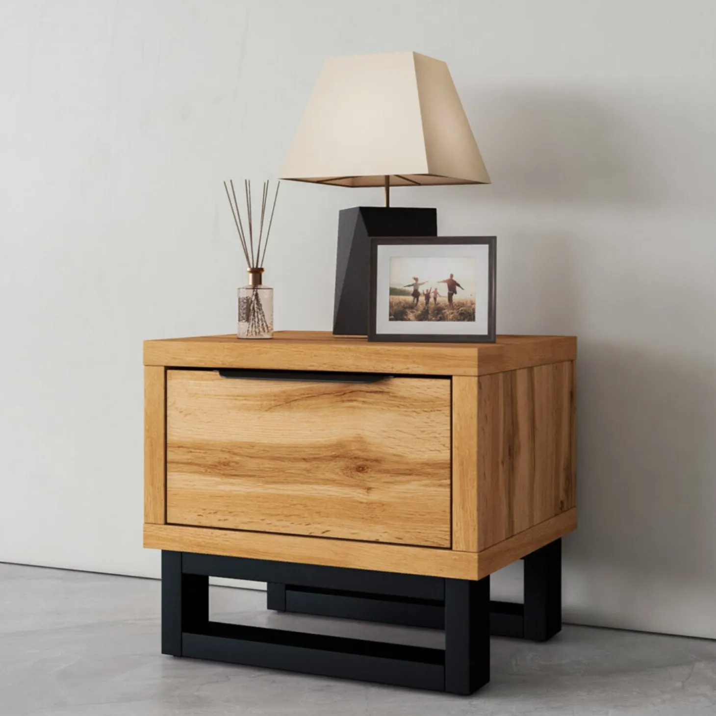Het Nachtkastje Halmstad met Lade combineert een strak, minimalistisch ontwerp met de warme uitstraling van massief eiken hout. De zichtbare houtnerf en natuurlijke afwerking geven dit meubel een karaktervolle uitstraling die rust brengt in elke slaapkamer.
