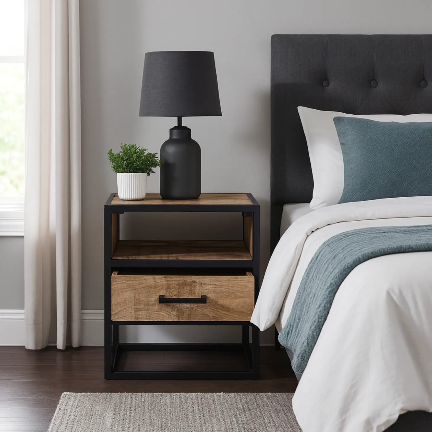 Nachtkastje Mick is een perfecte mix van robuust en functioneel. Het kastje is vervaardigd uit massief mangohout en staat stevig op een zwart metalen frame, wat zorgt voor een industriële uitstraling. Met een praktische lade en een open vak biedt Mick voldoende ruimte voor je nachtlamp, boek of andere essentials.