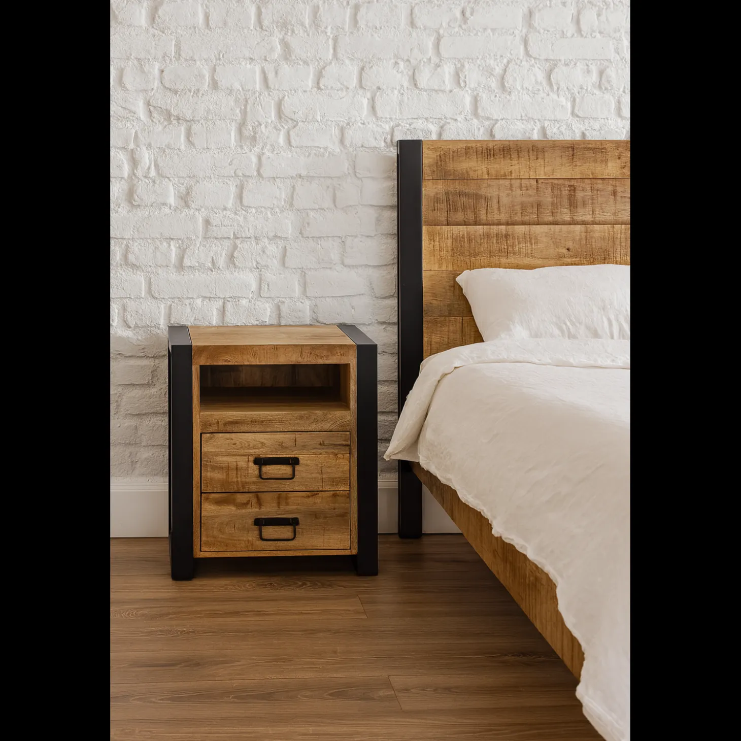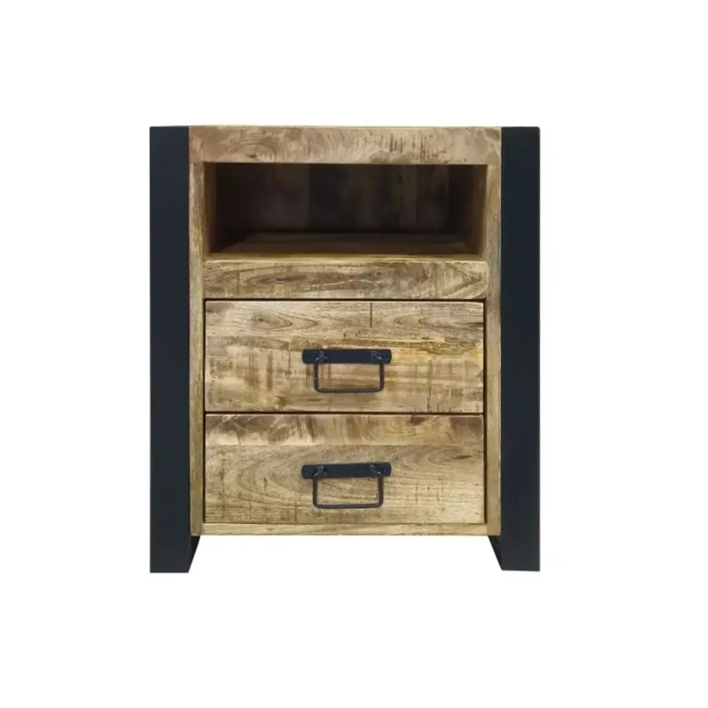 Nachtkastje Tino is de ideale combinatie van design en gebruiksgemak. Gemaakt van robuust mangohout en voorzien van een stevig zwart metalen frame, straalt Tino een industriële charme uit die perfect past in een modern of stoer interieur. Het kastje beschikt over twee praktische lades voor het opbergen van kleine spullen én een open vak voor bijvoorbeeld je favoriete boek, telefoon of decoratie.