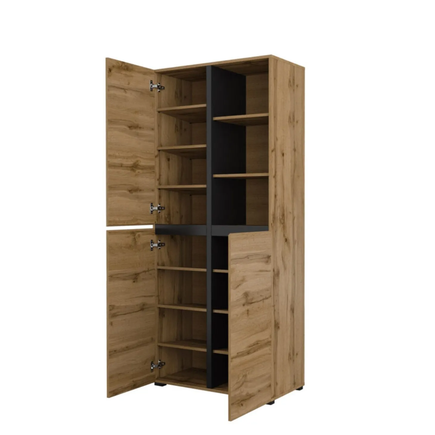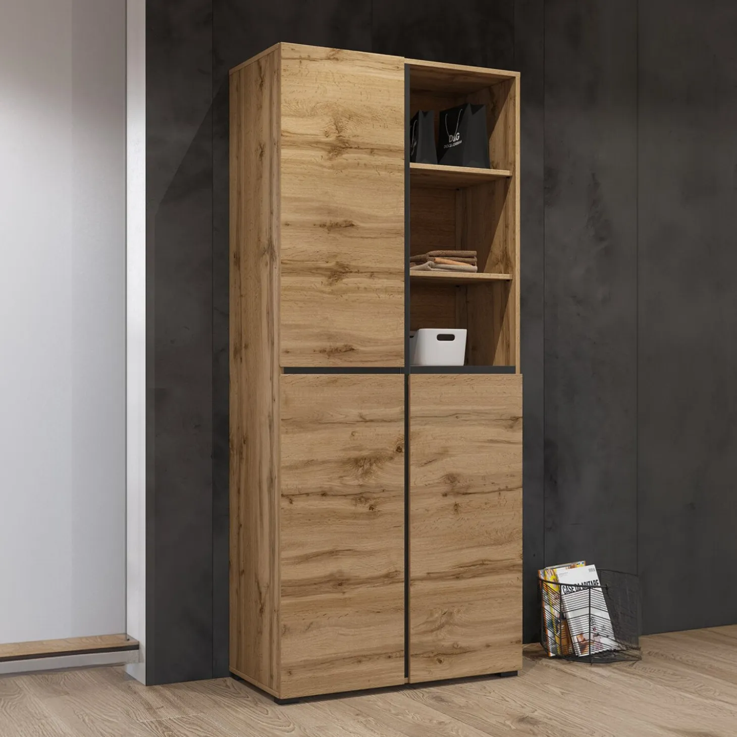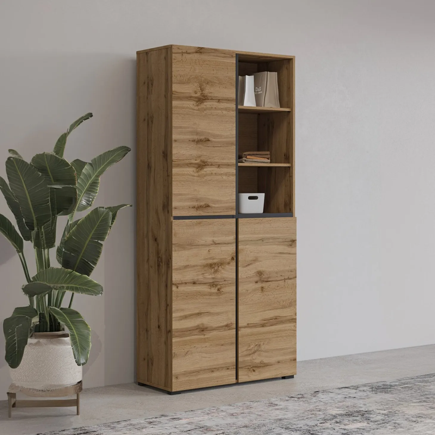 De opbergkast Crotone heeft een strak en modern ontwerp met een combinatie van gesloten vakken en open opbergruimte. Het open gedeelte met legplanken biedt plek voor spullen die je graag binnen handbereik houdt, terwijl de kastdeuren zorgen voor een rustig en opgeruimd geheel. De rechte lijnen en greeploze afwerking geven de kast een nette en eigentijdse uitstraling.