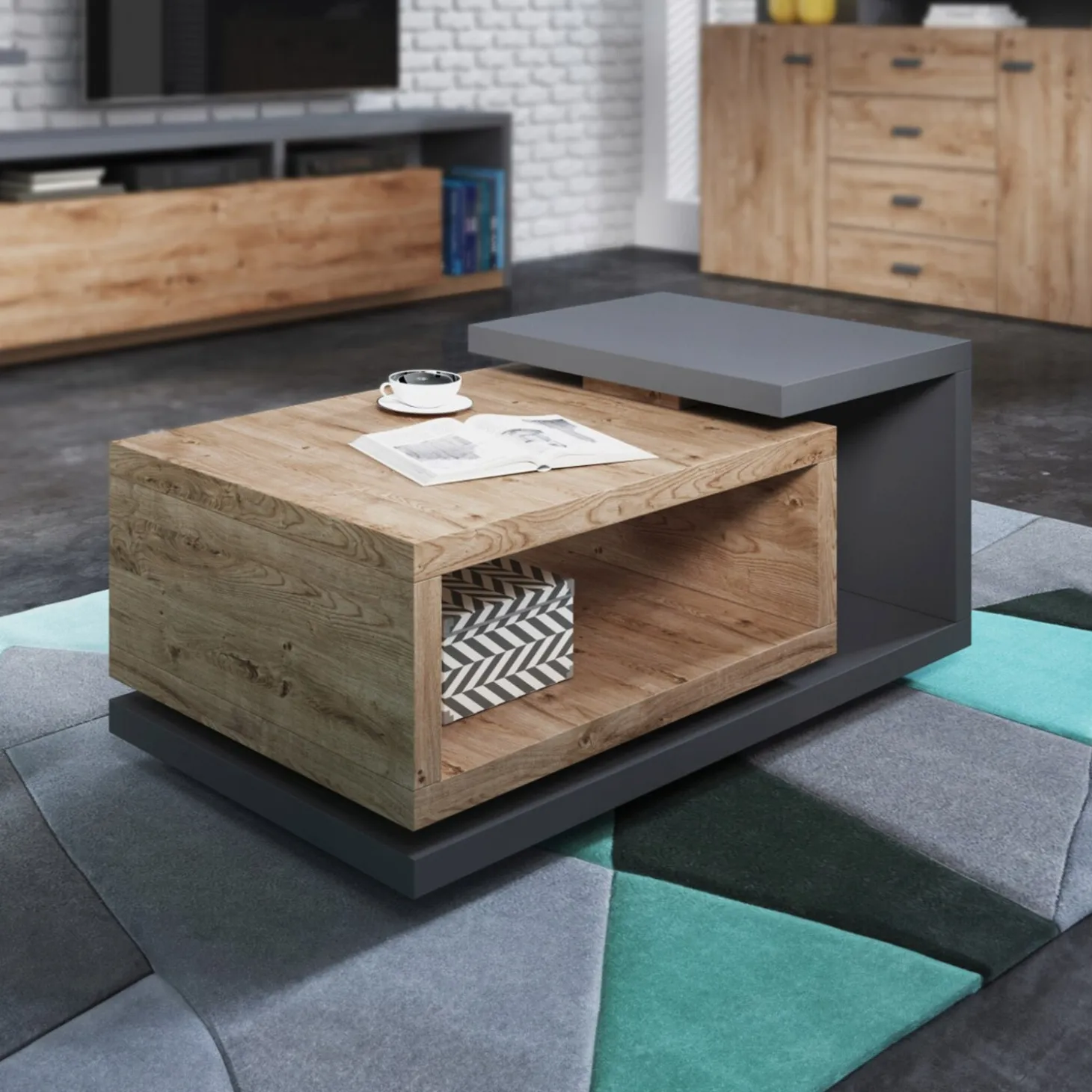 Het brede blad biedt volop ruimte voor decoratie of een gezellig koffiemoment. Het open vak onder het houten gedeelte maakt het eenvoudig om spullen netjes op te bergen zonder dat de tafel massief oogt. Dankzij de combinatie van materialen past dit model moeiteloos in een modern interieur.