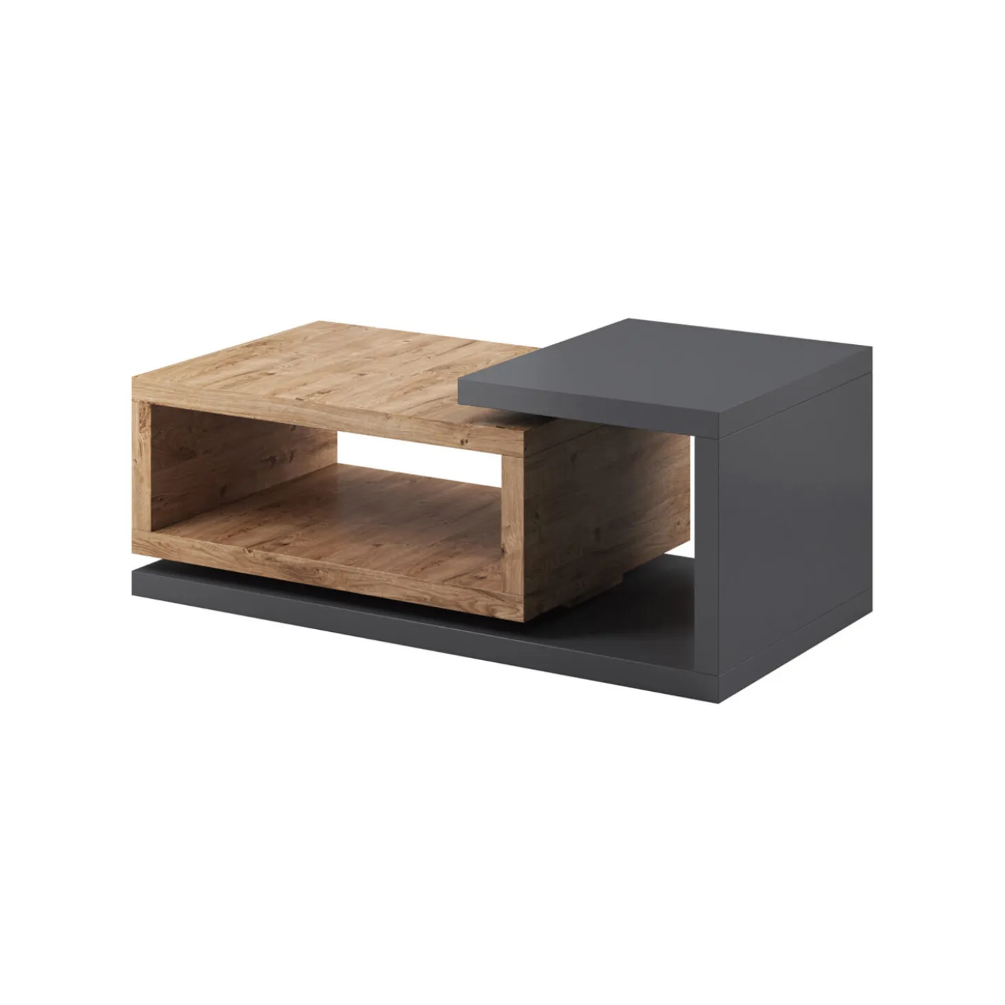Salontafel Bologna combineert een robuust houten blok met een strak zwevend bovenblad in antraciet. Het open middenvak zorgt voor lucht in het ontwerp, terwijl de brede bodemplaat het geheel een krachtige basis geeft. Door de duidelijke lijnen en het contrast ontstaat een moderne en stoere uitstraling.