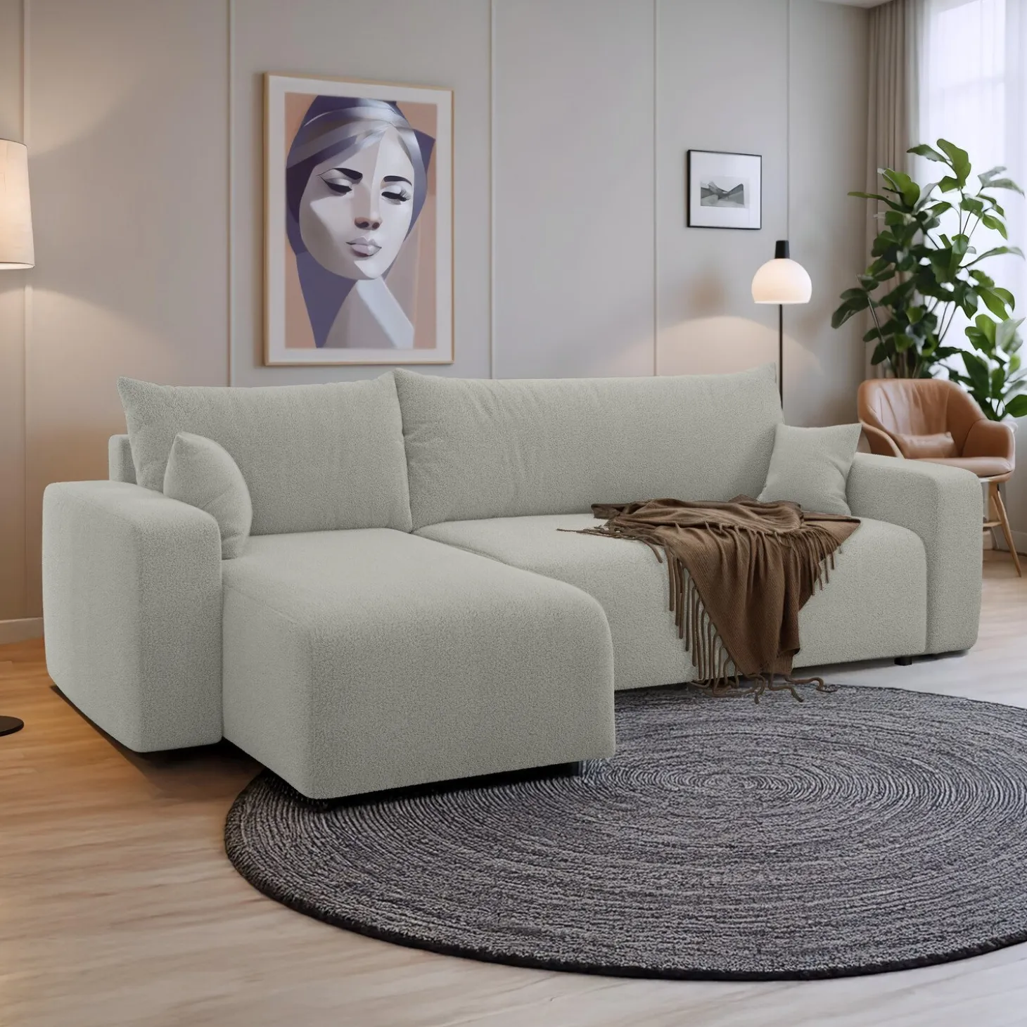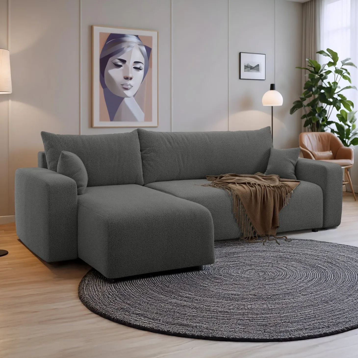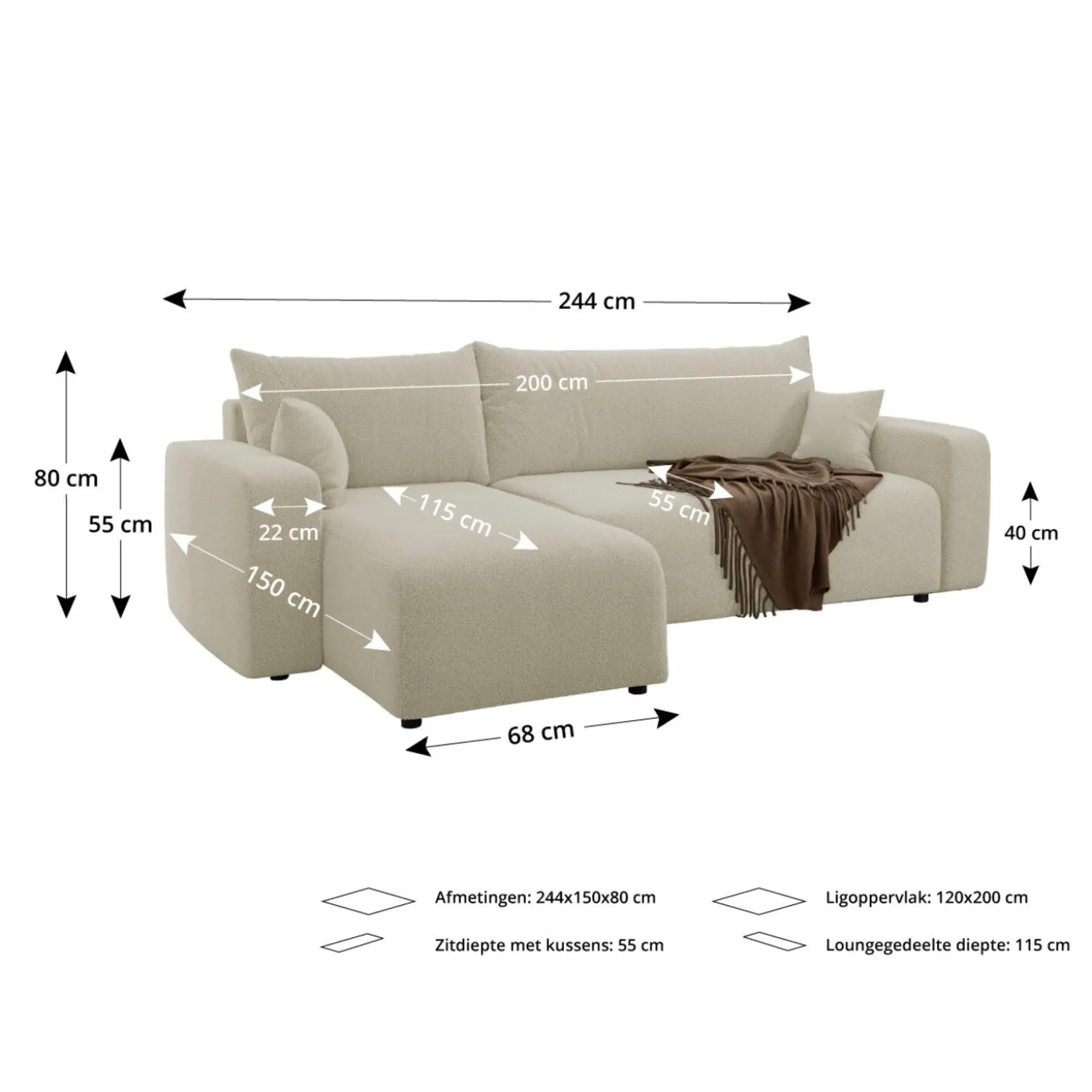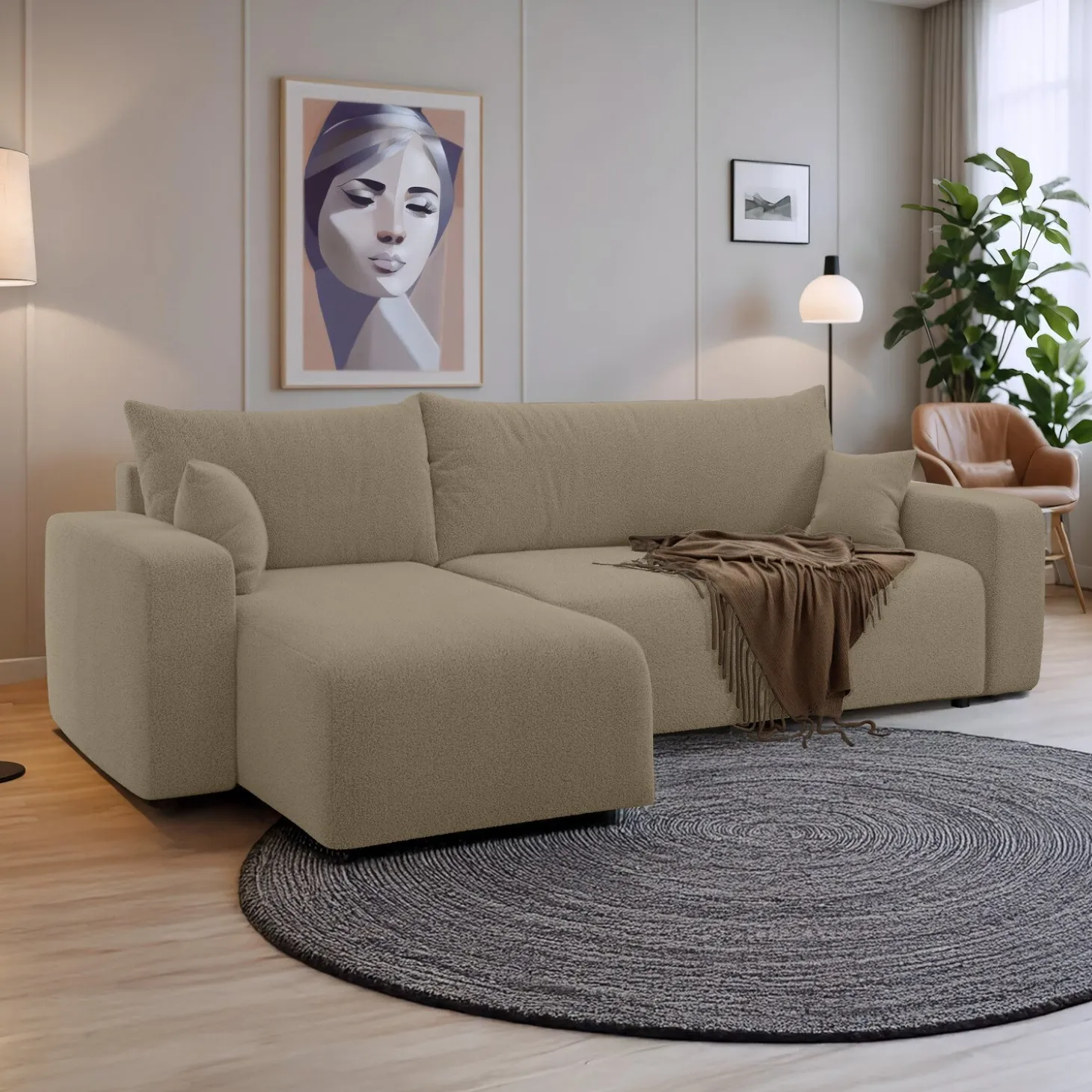 Combineer warmte, stijl en praktisch gemak in één meubelstuk: de Teddy stof Pim is je nieuwe favoriete hoekbank, slaapbank én opbergingsoplossing. Met zijn universele opstelling past hij perfect in elke woonkamer, en met een soepele actie tover je hem om tot een comfortabel slaapbed.