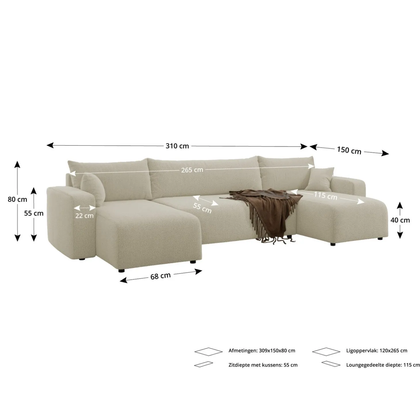 Deze U-bank is niet alleen mooi, maar ook praktisch. Onder het zitgedeelte vind je een ruime opbergruimte, groot genoeg voor kussens, dekens of andere spullen die je graag binnen handbereik maar uit het zicht hebt. Zo houd je je woonkamer netjes, zonder extra opbergmeubels nodig te hebben.
