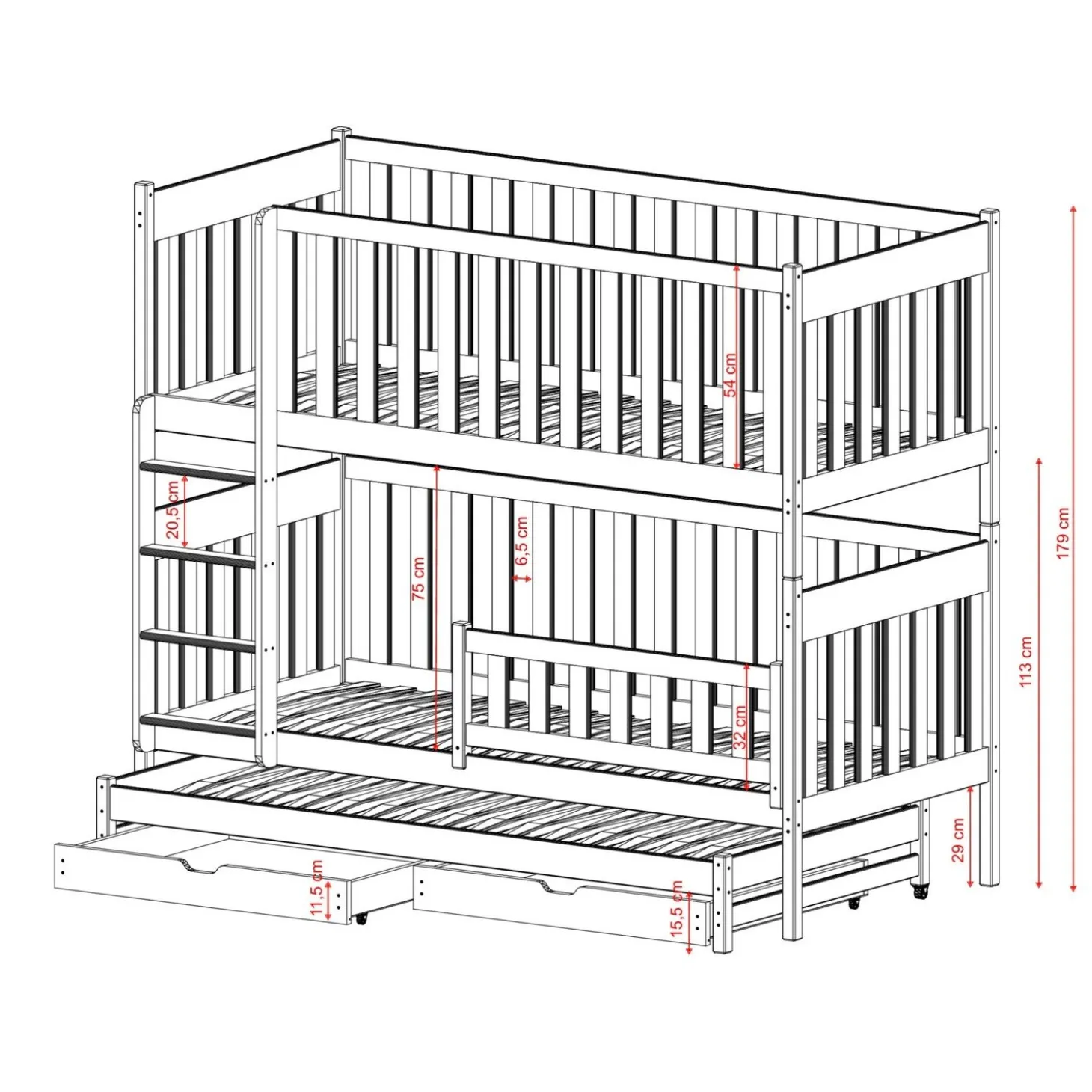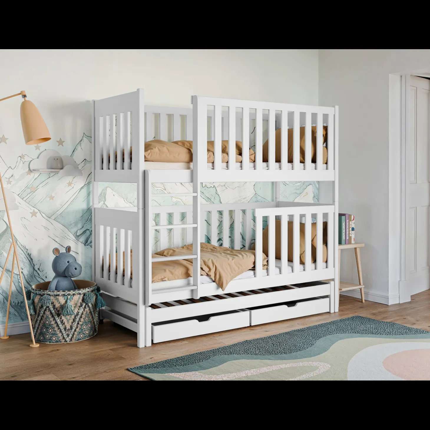 Het stapelbed Emiel heeft een strak en functioneel ontwerp met rondom rechte spijlen en een duidelijke opbouw in lagen. De twee slaapniveaus worden aangevuld met een extra uitschuifbaar bed en praktische opberglades onderin. Hierdoor ontstaat een complete en ruimtebesparende oplossing waarin slapen en opbergen slim gecombineerd zijn.