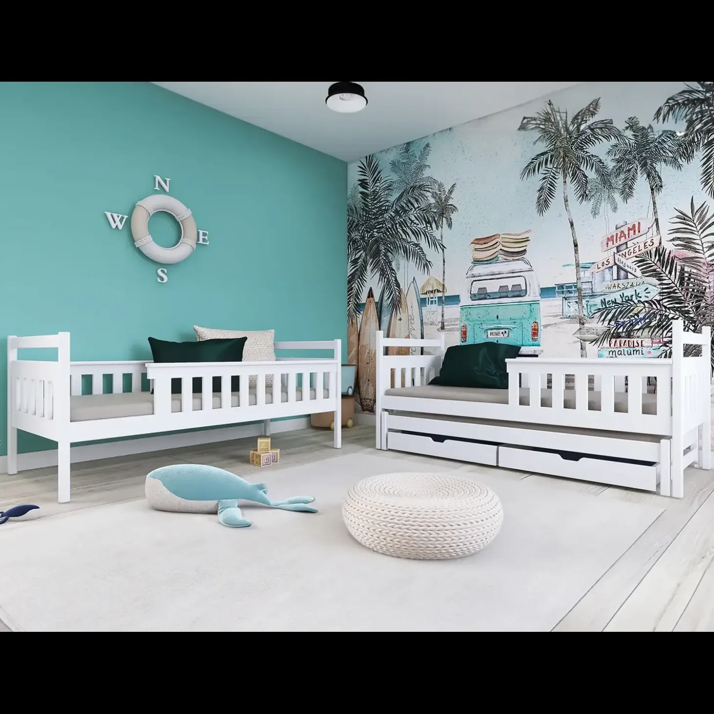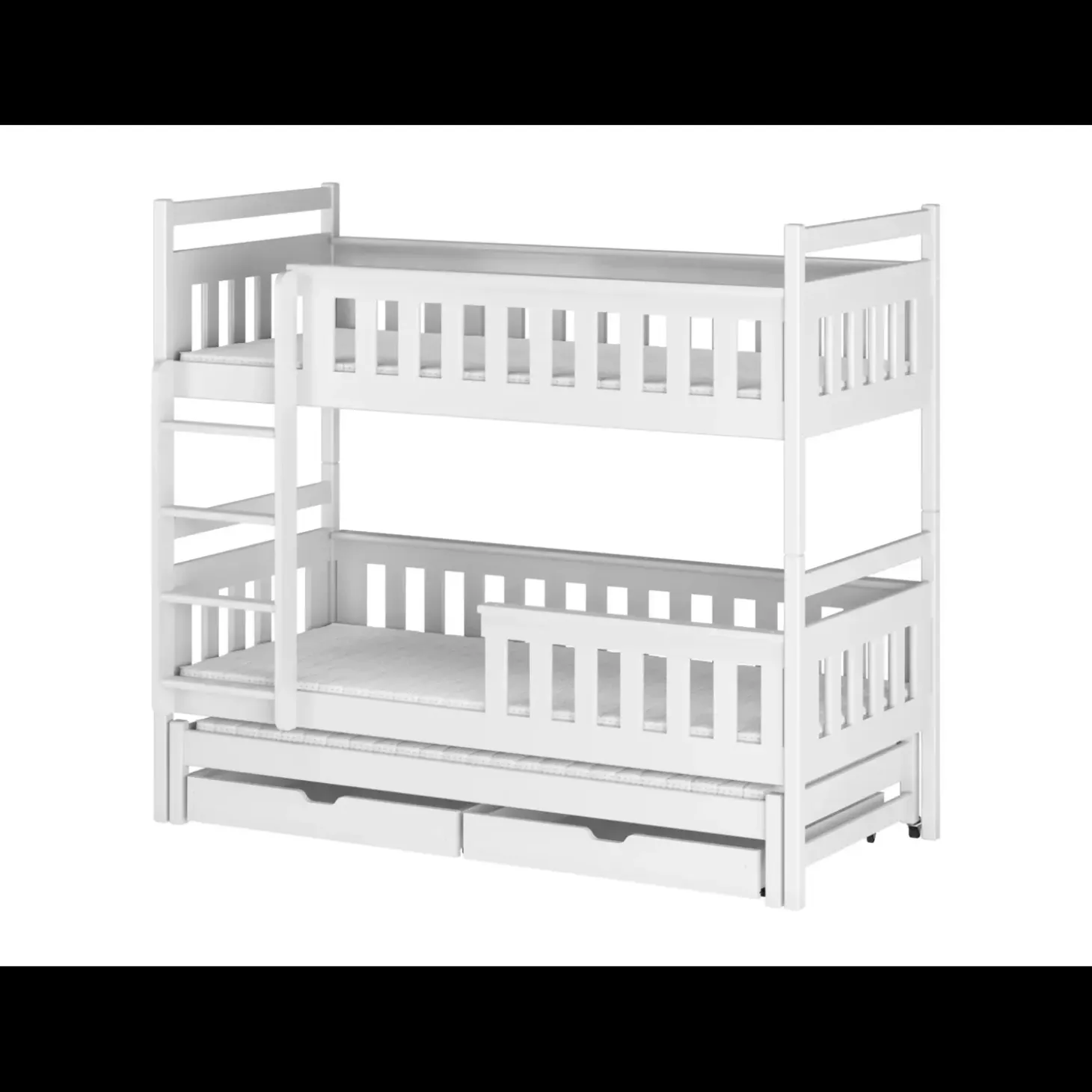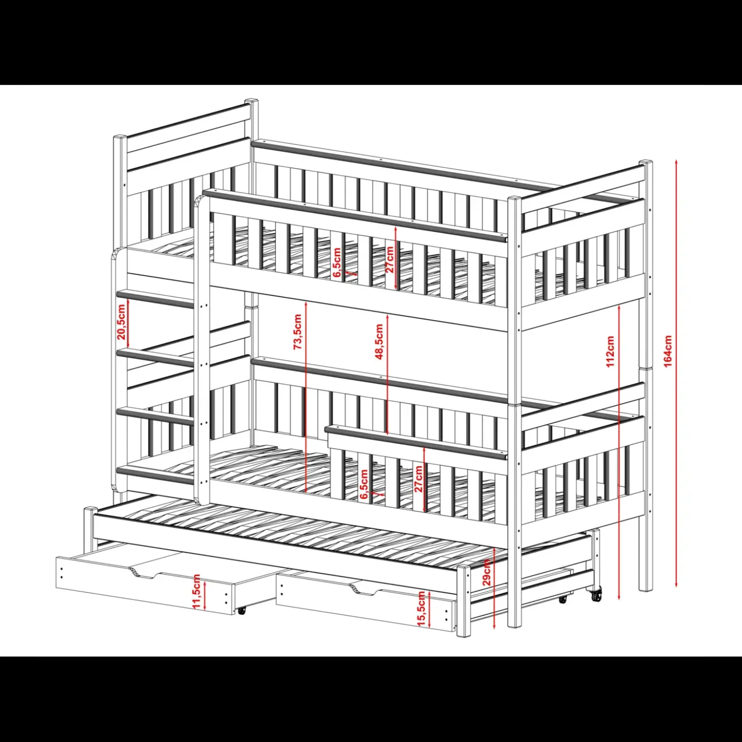 Het stapelbed Kobe heeft een strak en functioneel ontwerp met rondom rechte spijlen en een duidelijke opbouw in lagen. De twee slaapniveaus worden aangevuld met een extra uitschuifbaar bed en praktische opberglades onderin. Hierdoor ontstaat een complete en ruimtebesparende oplossing waarin slapen en opbergen slim gecombineerd zijn.