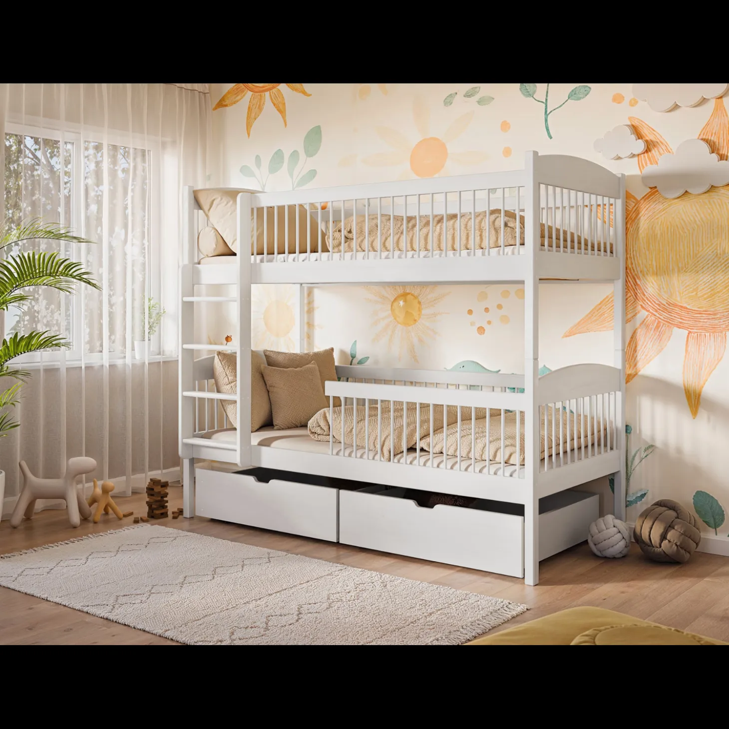 Het stapelbed Lucas heeft een zachte en rustige uitstraling met afgeronde vormen en fijne spijlen rondom. De twee slaaplagen zijn overzichtelijk opgebouwd, terwijl de geïntegreerde lades onder het bed zorgen voor extra opbergruimte. Het ontwerp combineert functionaliteit met een vriendelijke uitstraling die mooi opgaat in de kinderkamer.