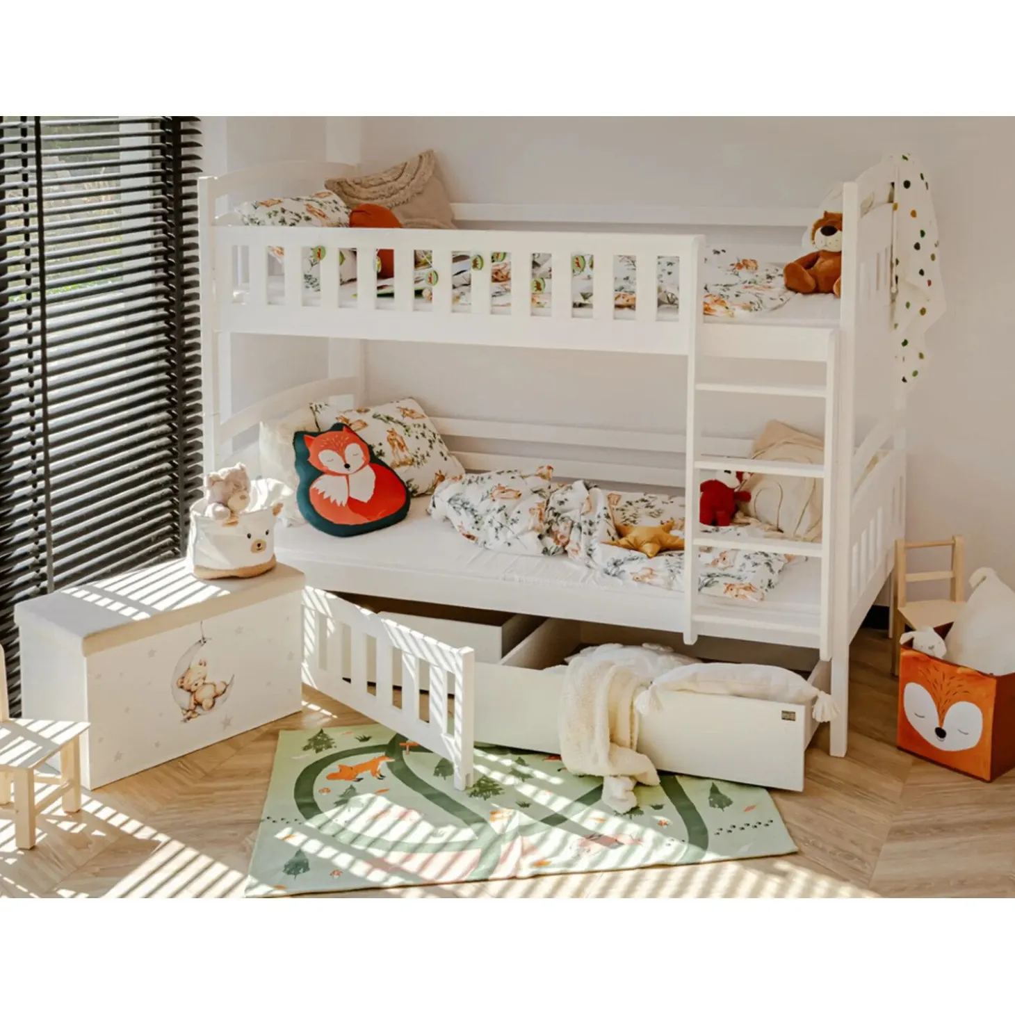 Stapelbed Ilias voor 2 kinderen is een praktische keuze als je ruimte wilt besparen maar wel twee aparte slaapplekken nodig hebt. De bedden boven elkaar besparen kostbare ruimte, en de opberglade onder het bed biedt extra plek voor speelgoed, beddengoed of kleding. Ideaal voor broertjes, zusjes of logees.