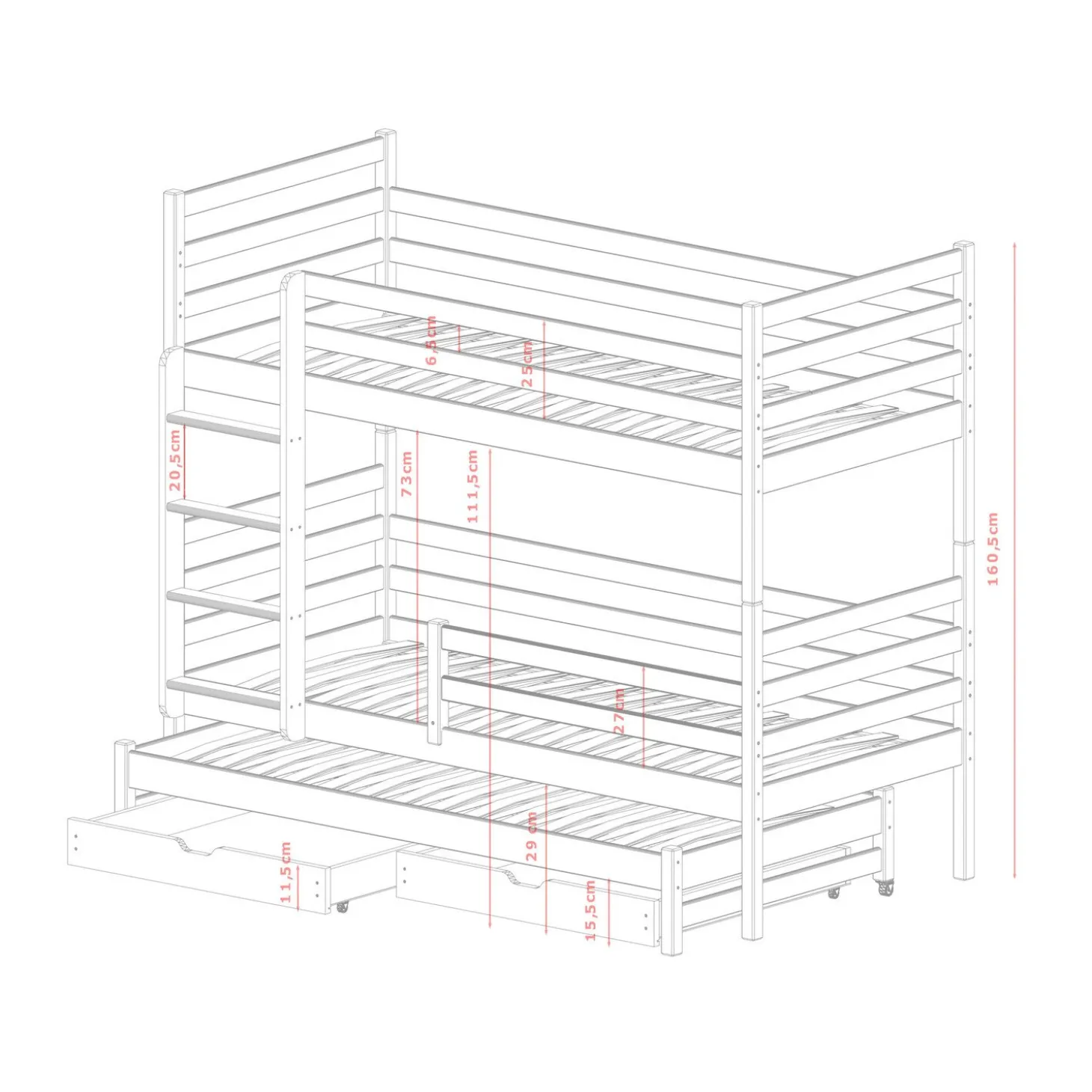 Stapelbed Luuk bespaart ruimte met drie aparte slaapplekken. Perfect voor broers, zussen of logees, gemaakt van stevig massief hout en ontworpen met oog voor veiligheid.