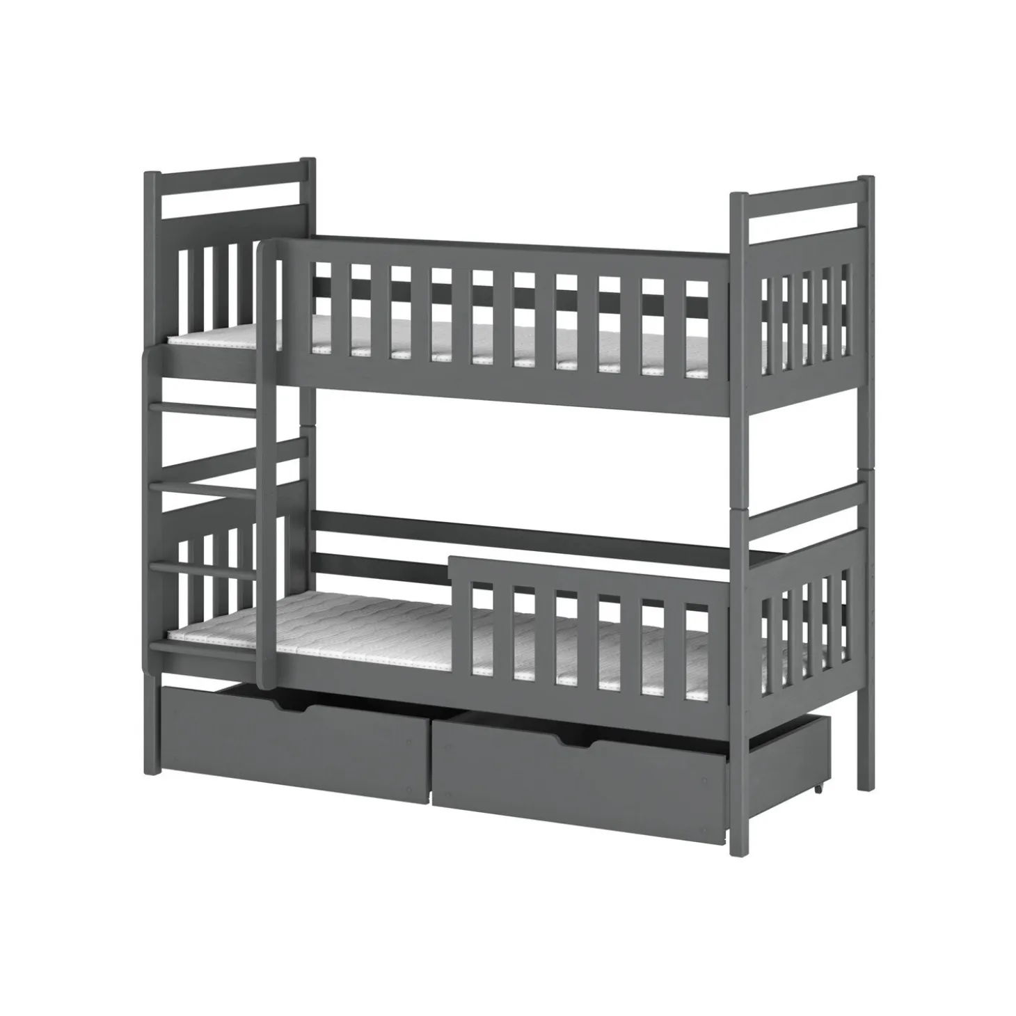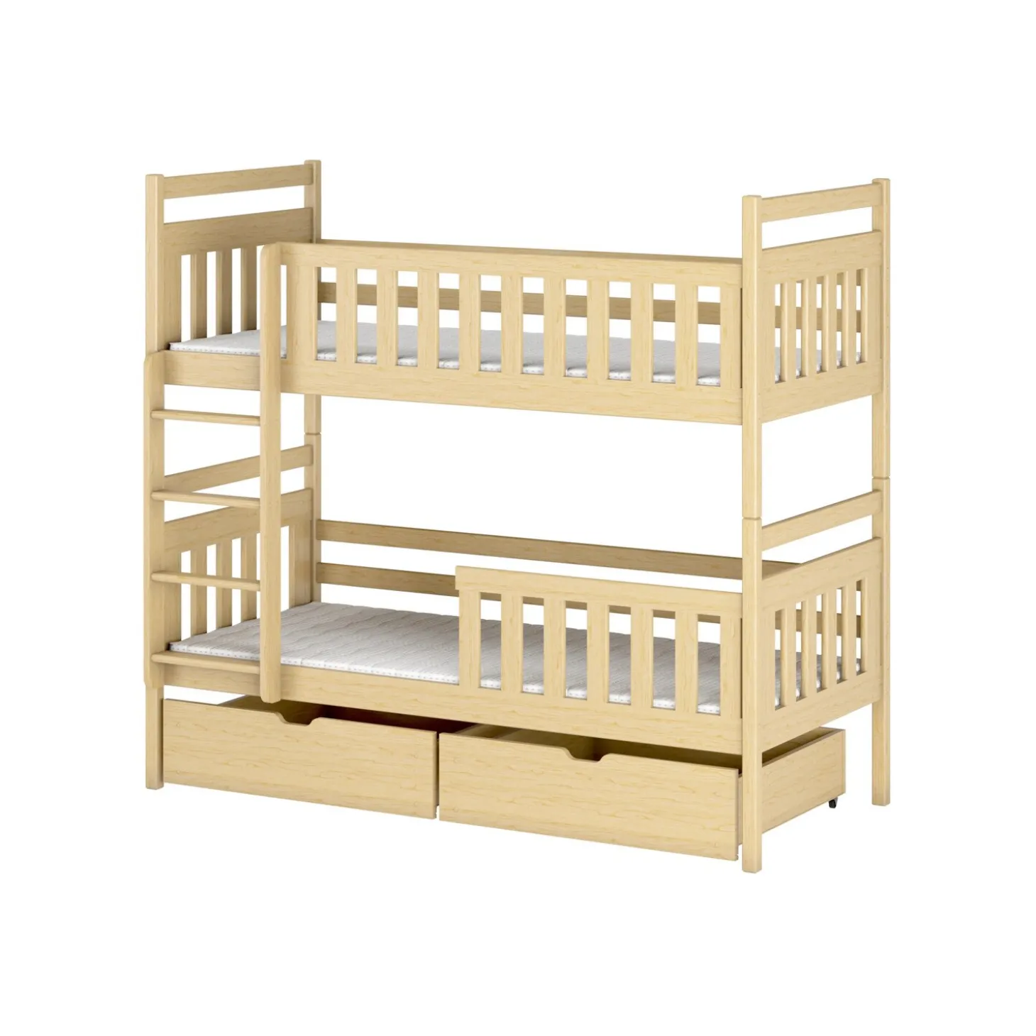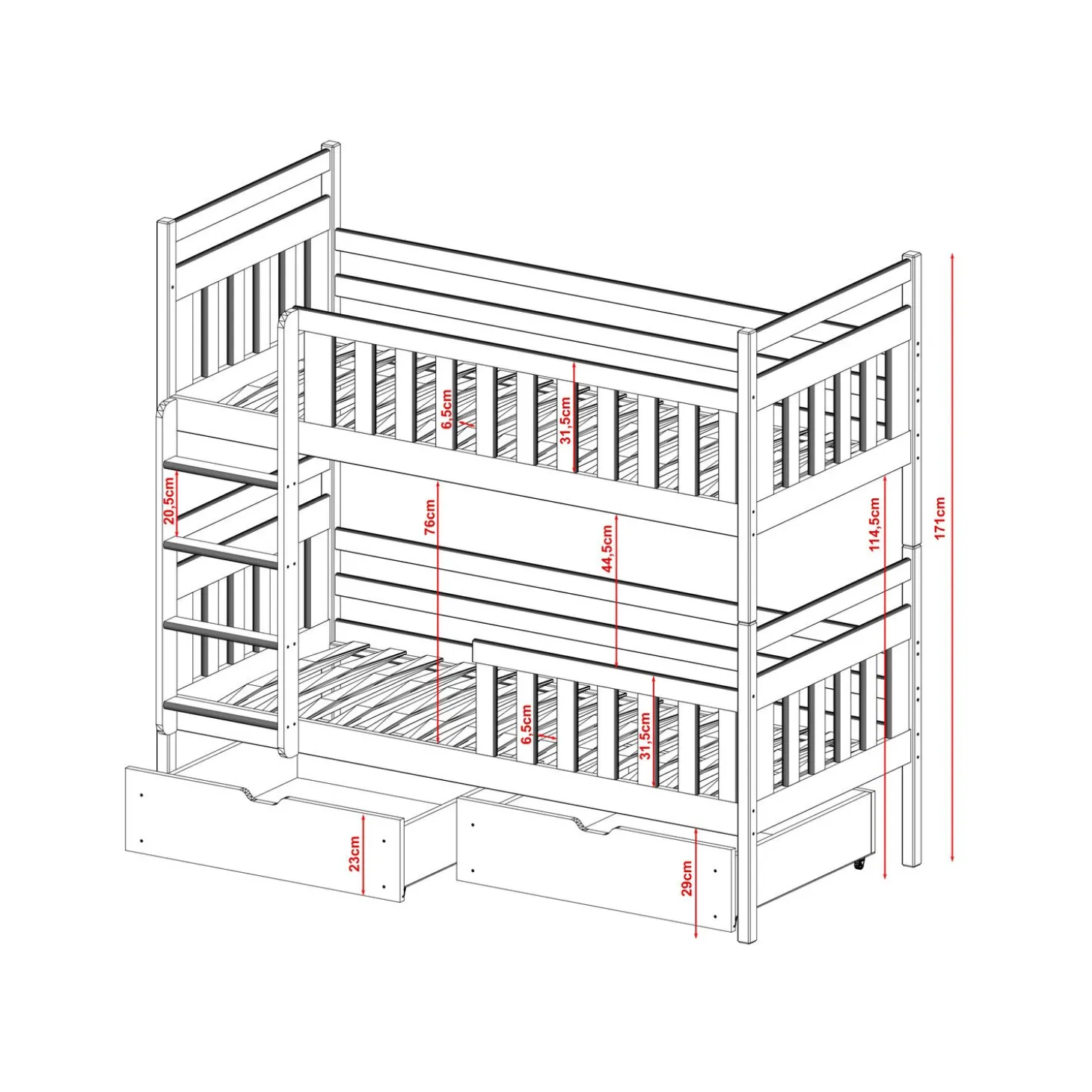 Stapelbed Mira is een ruimtebesparend bed met twee slaapplekken boven elkaar en een handige opberglade eronder. Ideaal voor kinderen die een kamer delen of logees. Gemaakt van stevig massief hout en voorzien van een kindvriendelijk ontwerp.