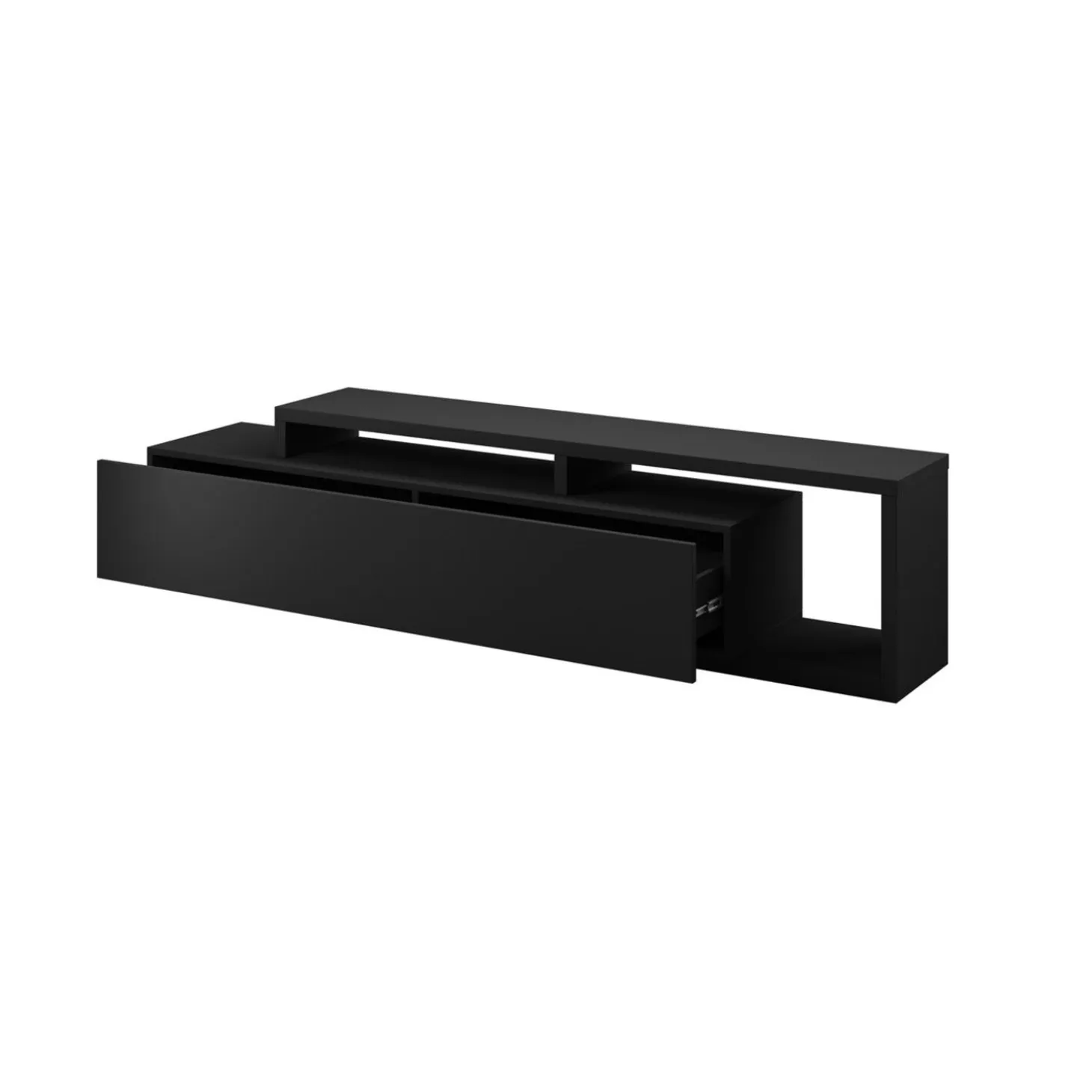 TV-meubel Bologna heeft een strak en laag ontwerp dat direct rust brengt aan de wand. De lange horizontale vorm benadrukt de breedte van de ruimte, terwijl het verhoogde bovenblad met open vakken zorgt voor diepte en gelaagdheid. Het gesloten front in combinatie met de open zijkant geeft het meubel een modern en uitgebalanceerd karakter.