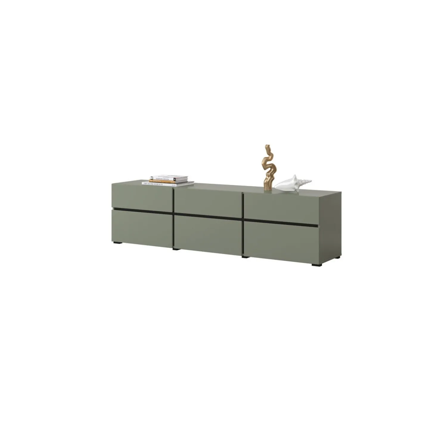 TV-meubel Crotone heeft een strak en modern ontwerp met een duidelijke horizontale focus. De lage, brede vorm zorgt voor rust onder de televisie en laat de wand optisch langer lijken. De zes fronten zijn symmetrisch verdeeld en worden visueel verbonden door een subtiele horizontale belijning, wat het meubel een evenwichtig en gestructureerd karakter geeft. Door het gesloten ontwerp blijft de woonkamer overzichtelijk en strak ingericht.