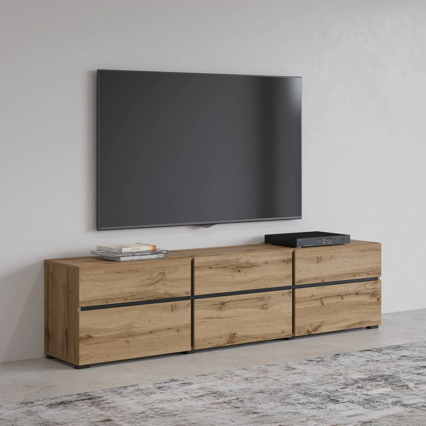 TV-meubel Crotone kenmerkt zich door een krachtig horizontaal ontwerp met een robuuste uitstraling. De brede, doorlopende fronten zorgen voor een strak en evenwichtig geheel, terwijl de subtiele horizontale belijning het meubel visueel in twee delen verdeelt. Door de lage en langgerekte vorm blijft de wand rustig en oogt de ruimte breder en overzichtelijker.