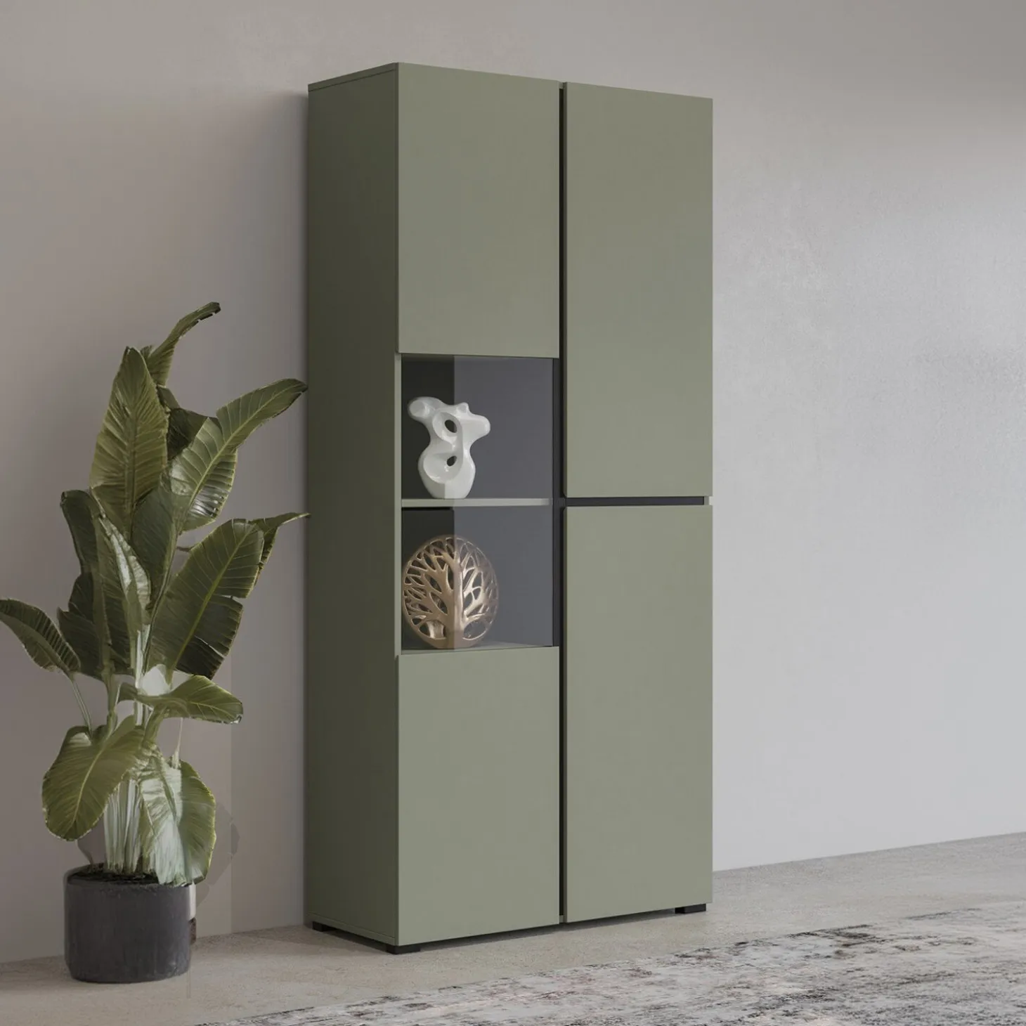 De vitrinekast Crotone heeft een strak en modern ontwerp met een combinatie van gesloten fronten en een open displayvak. Het open gedeelte biedt ruimte om accessoires zichtbaar neer te zetten, terwijl de overige vakken zorgen voor praktische opbergruimte. De rechte lijnen en greeploze afwerking geven de kast een rustige en eigentijdse uitstraling.