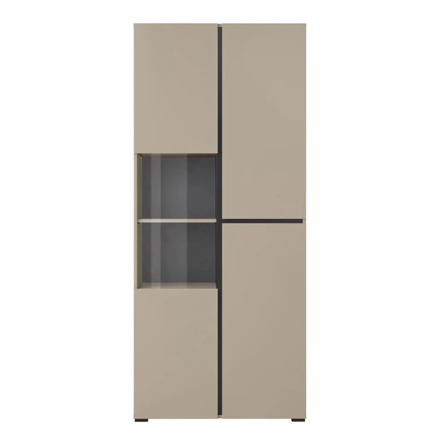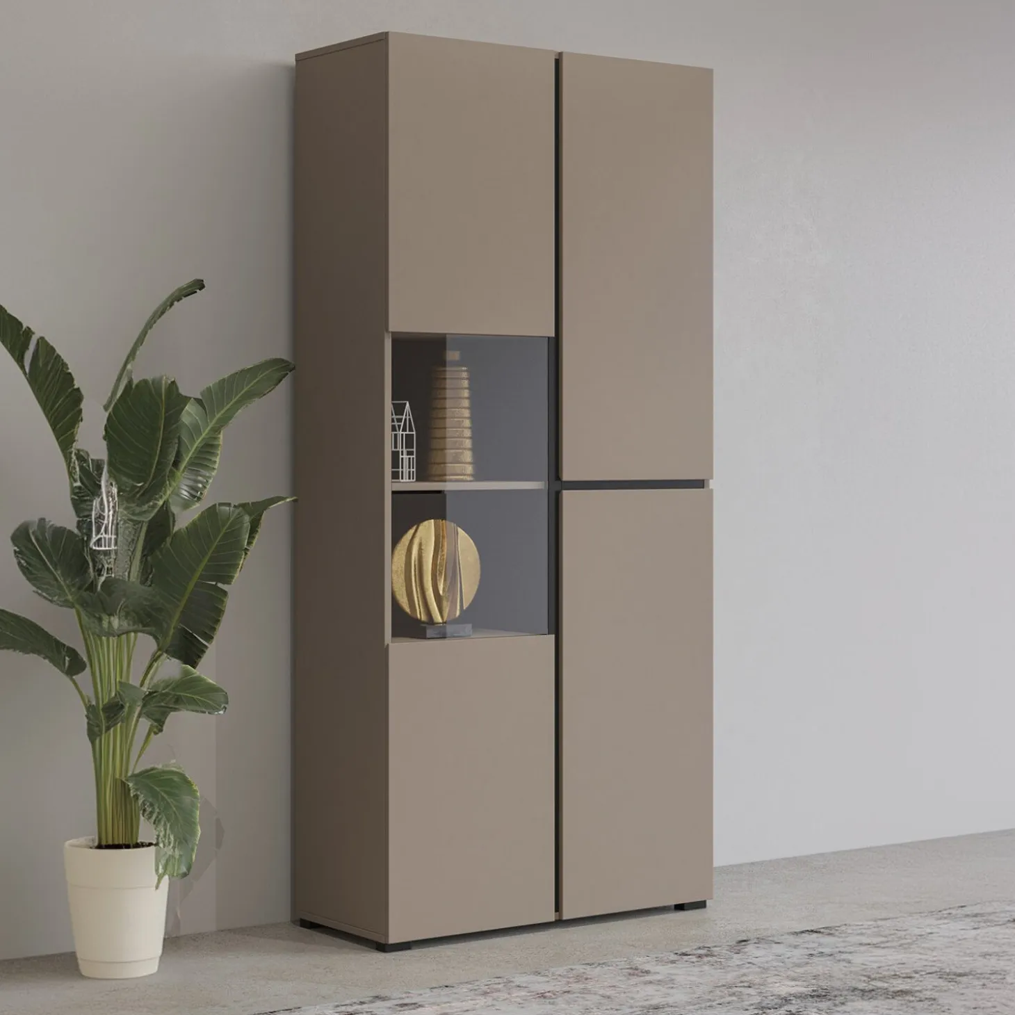De vitrinekast Crotone heeft een strak en modern ontwerp met een combinatie van gesloten fronten en een open displayvak. Het open gedeelte biedt ruimte om accessoires zichtbaar neer te zetten, terwijl de overige vakken zorgen voor praktische opbergruimte. De rechte lijnen en greeploze afwerking geven de kast een rustige en eigentijdse uitstraling.