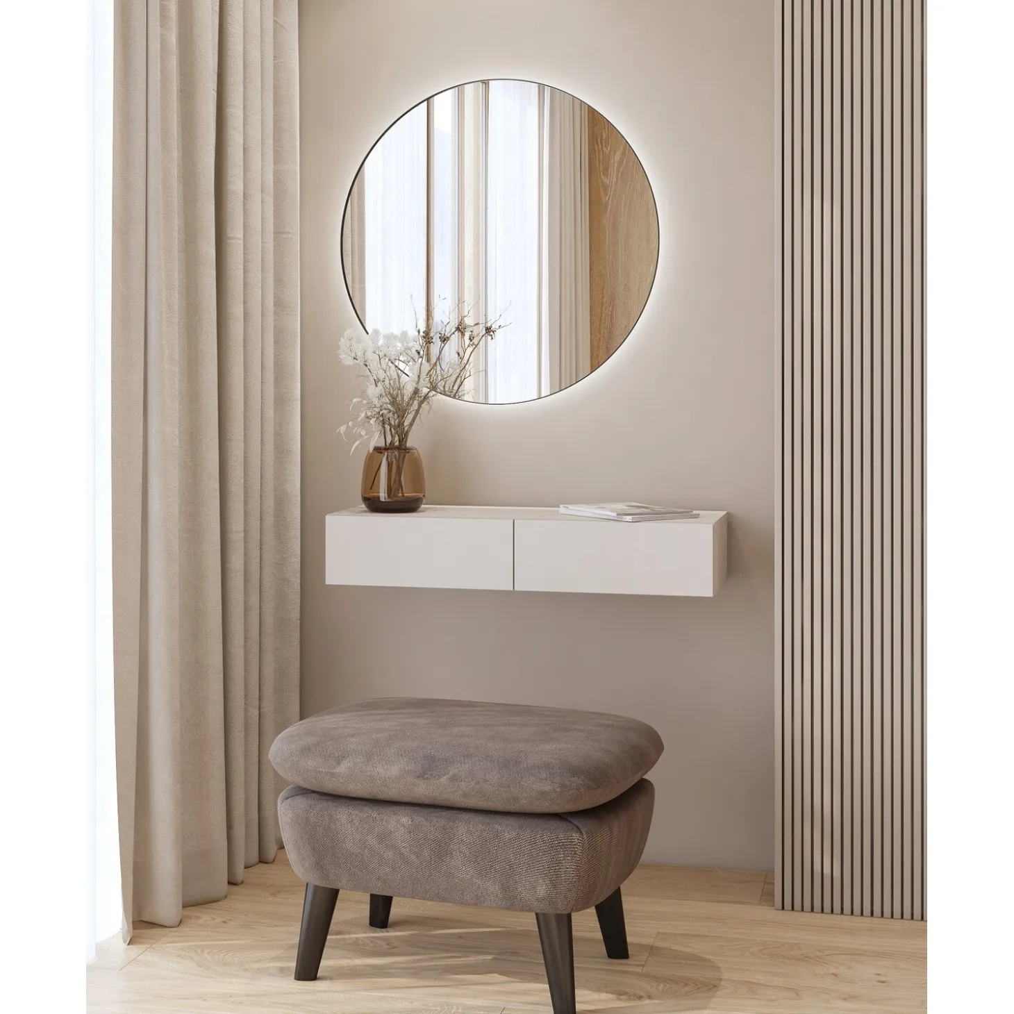 De Wandkaptafel Jura brengt elegantie en functionaliteit samen in een strak, zwevend ontwerp. Het minimalistische houten blad biedt voldoende ruimte voor make-up, sieraden of verzorgingsproducten en creëert tegelijk een luchtige uitstraling doordat het los van de vloer hangt. Dit maakt de kaptafel ideaal voor zowel compacte als ruime slaapkamers.