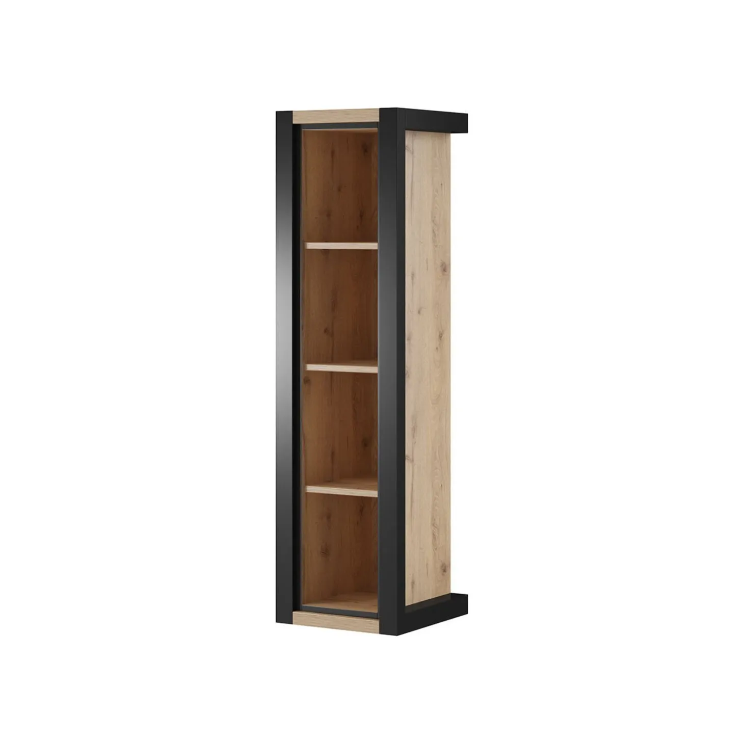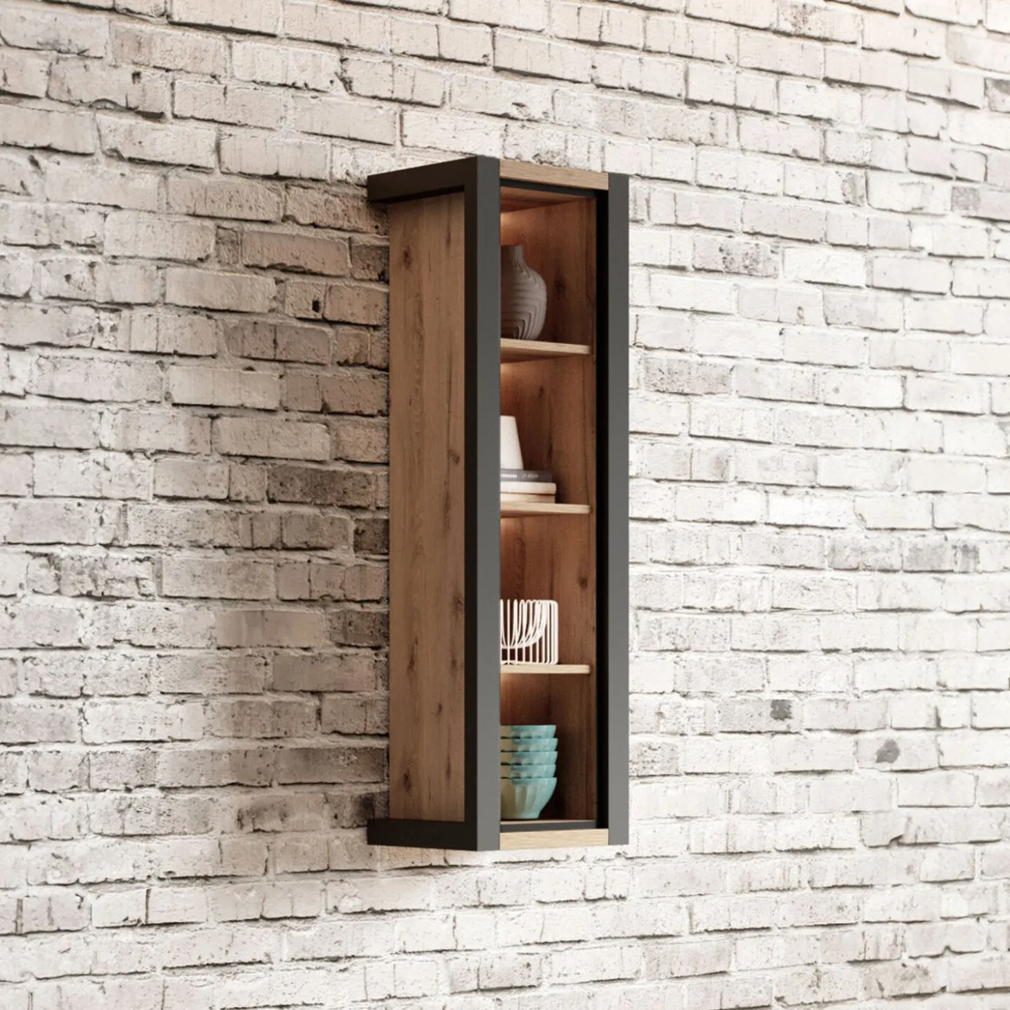 De wandkast Akven heeft een slanke en moderne uitstraling met een strak frame en open vakken. Door het verticale ontwerp en de open indeling is de kast ideaal om decoratie of servies stijlvol te presenteren zonder dat het zwaar oogt aan de muur.